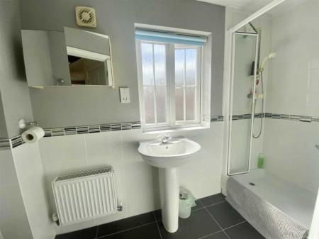 Ensuite Shower Room - Opaque Georgian style double glazed window to rear, pedestal hand wash basin, low level WC, ceramic tiled floor, part tiled walls, shaver point, fitted double shower cubicle with mains power shower, wall mounted mixer controls and shower hose and head.