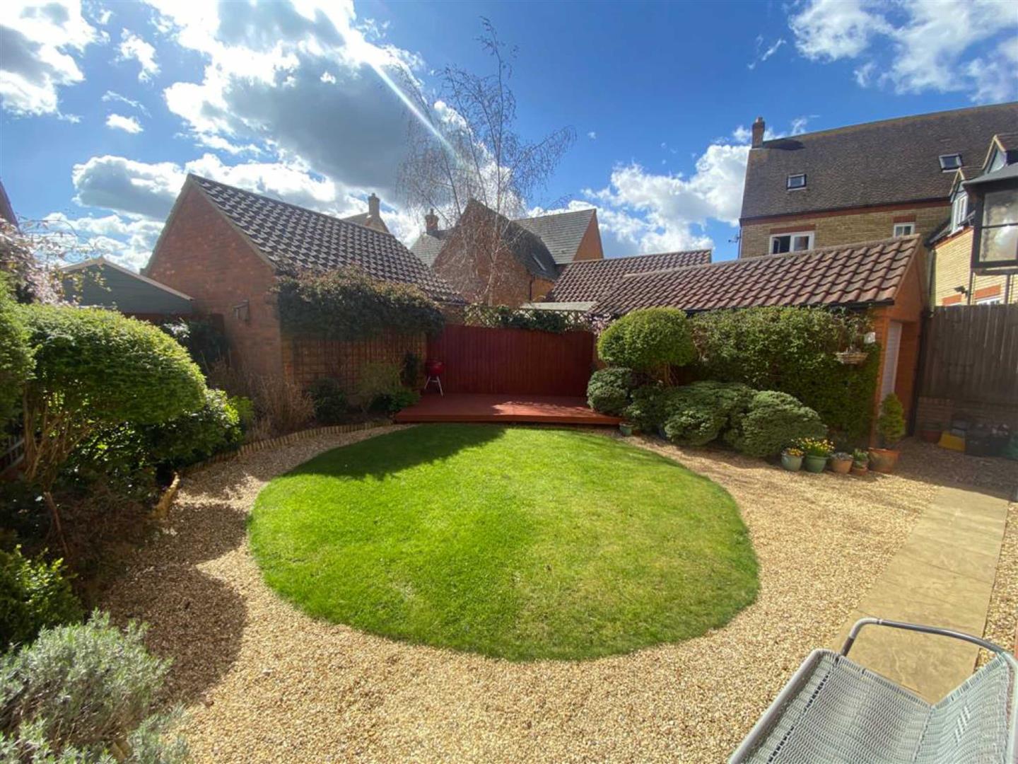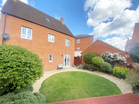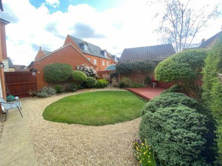Rear: Enclosed garden with a circular lawn, gravelled area, flower and shrub borders, raised decking, outside light, outside tap, trellis fencing, path to side.