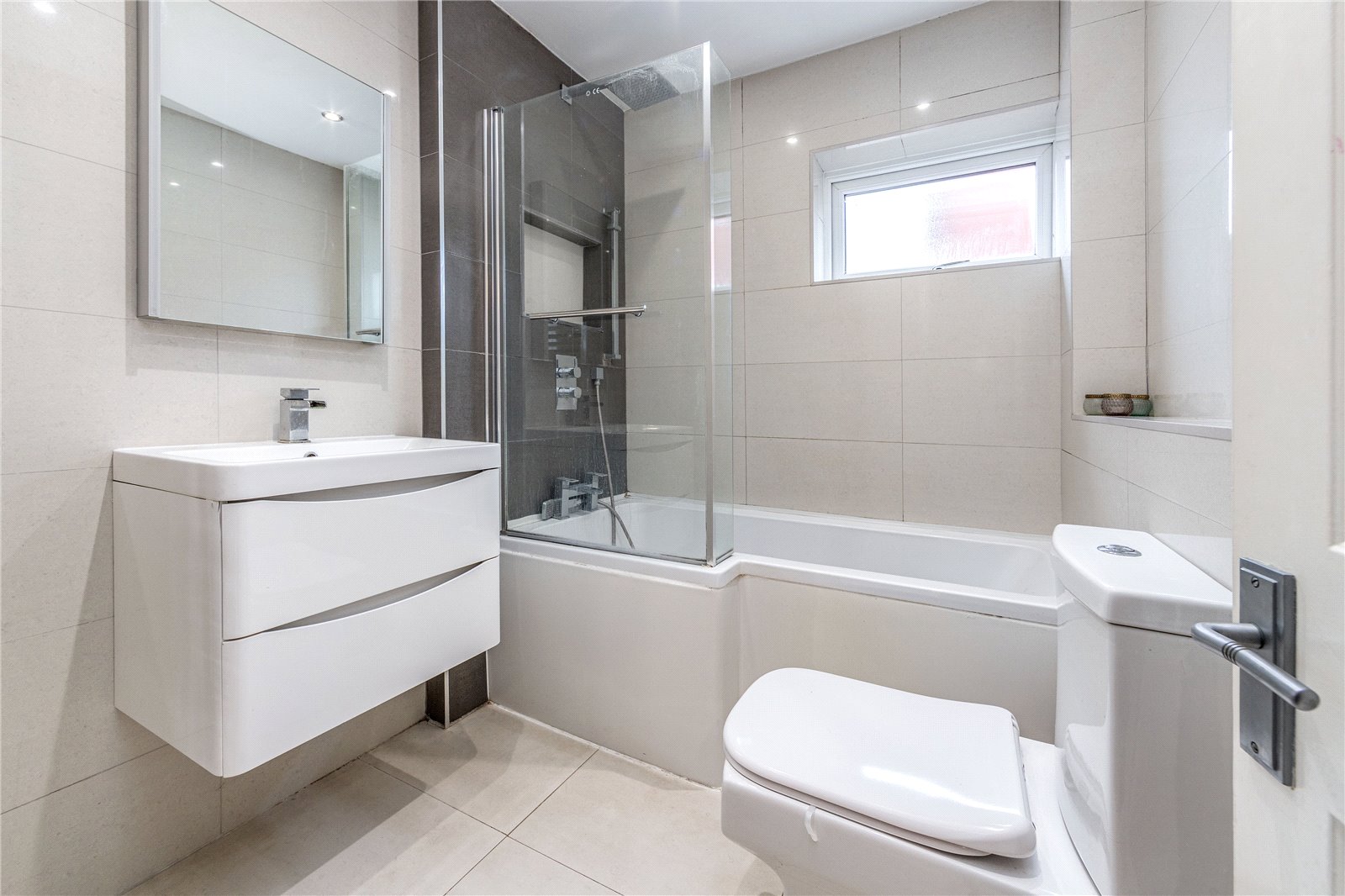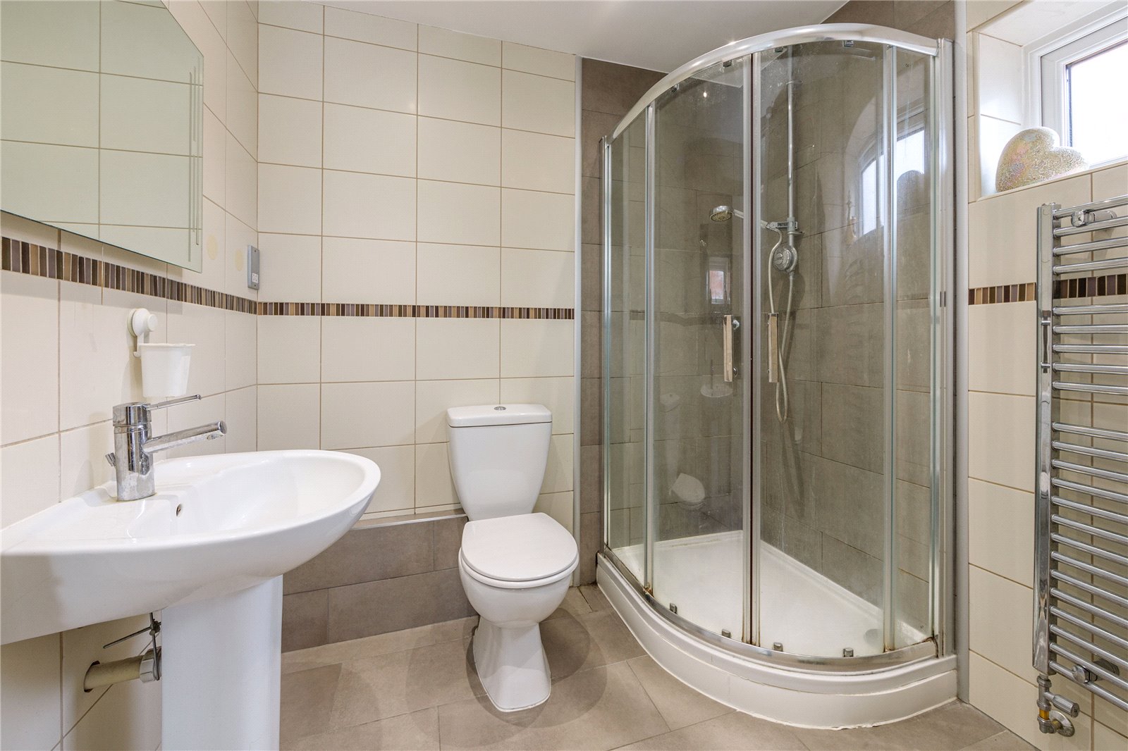 The principal bedroom is well suited, with its integrated wardrobes and access to an en suite equipped with a chrome heated towel rail, large shower and full tiling throughout. Bedroom two also has the additional benefit of built-in wardrobes. All bedrooms within this home are generously proportioned. The family bathroom offers a large panelled bath, low level WC and vanity sink.