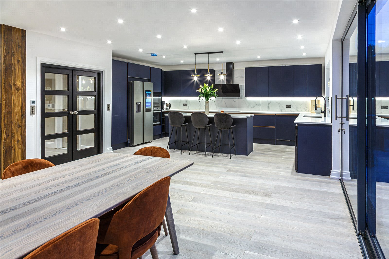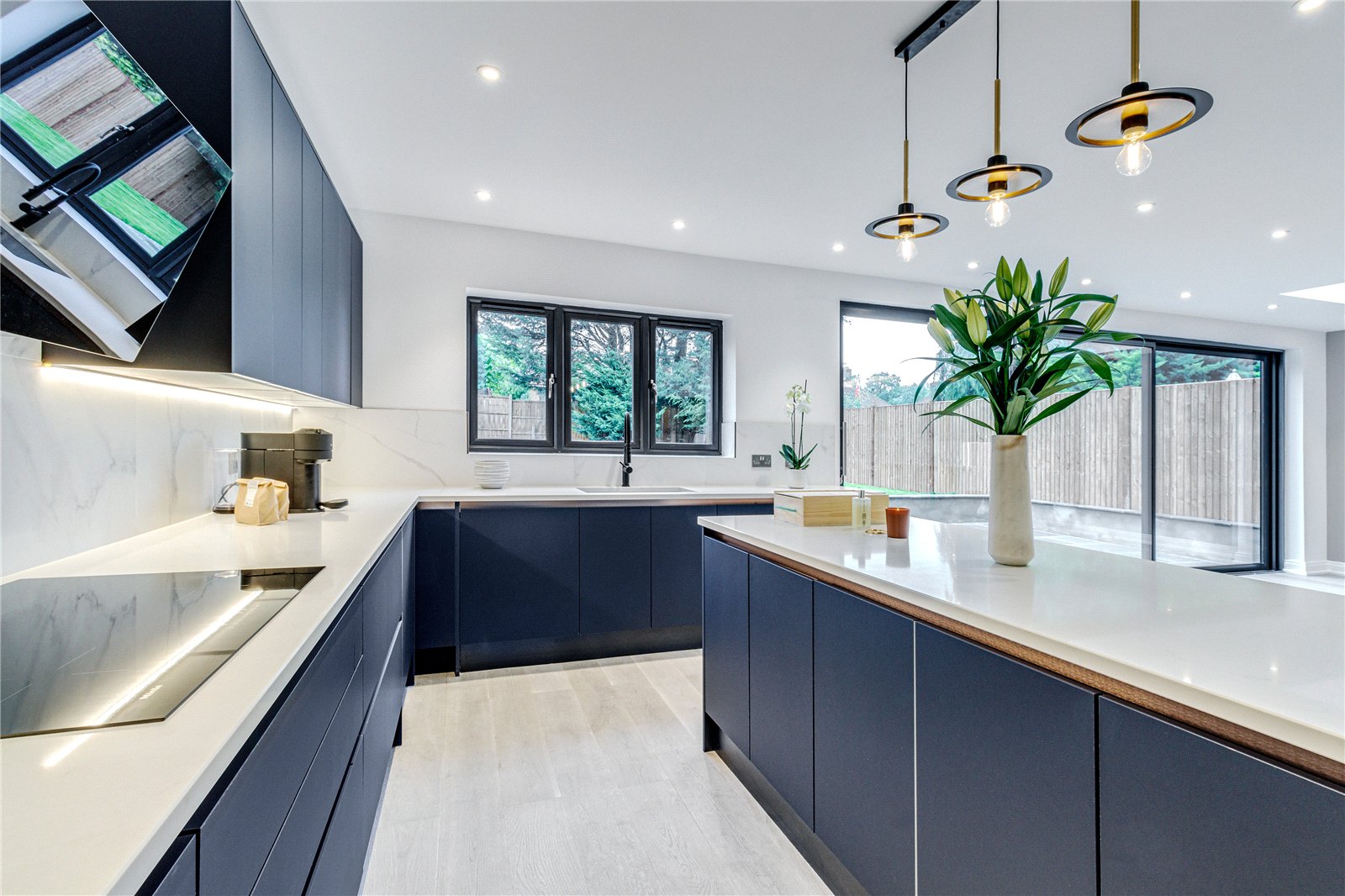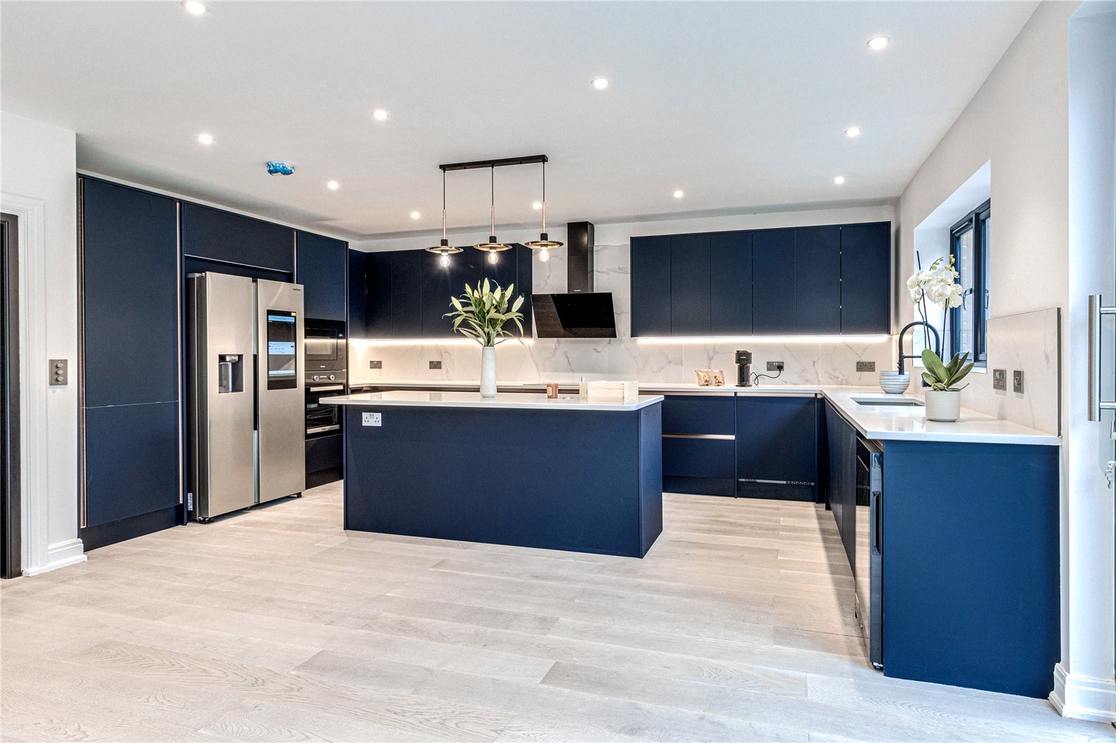 Upon entering this home, you are welcomed by the entrance hall leading on to the ground floor bedroom with Italian tiled en suite with underfloor heating, and then led onto the expansive open plan kitchen diner fitted with refined quartz worktops, kitchen island and Miele appliances. The kitchen and dining area then flows into the family living room, a great space fitted with a large media unit and bio ethanol fireplace. The garden can be accessed via anthracite sliding patio doors. The entire ground floor of this home is fitted with underfloor heating as well as the bathrooms within the property.