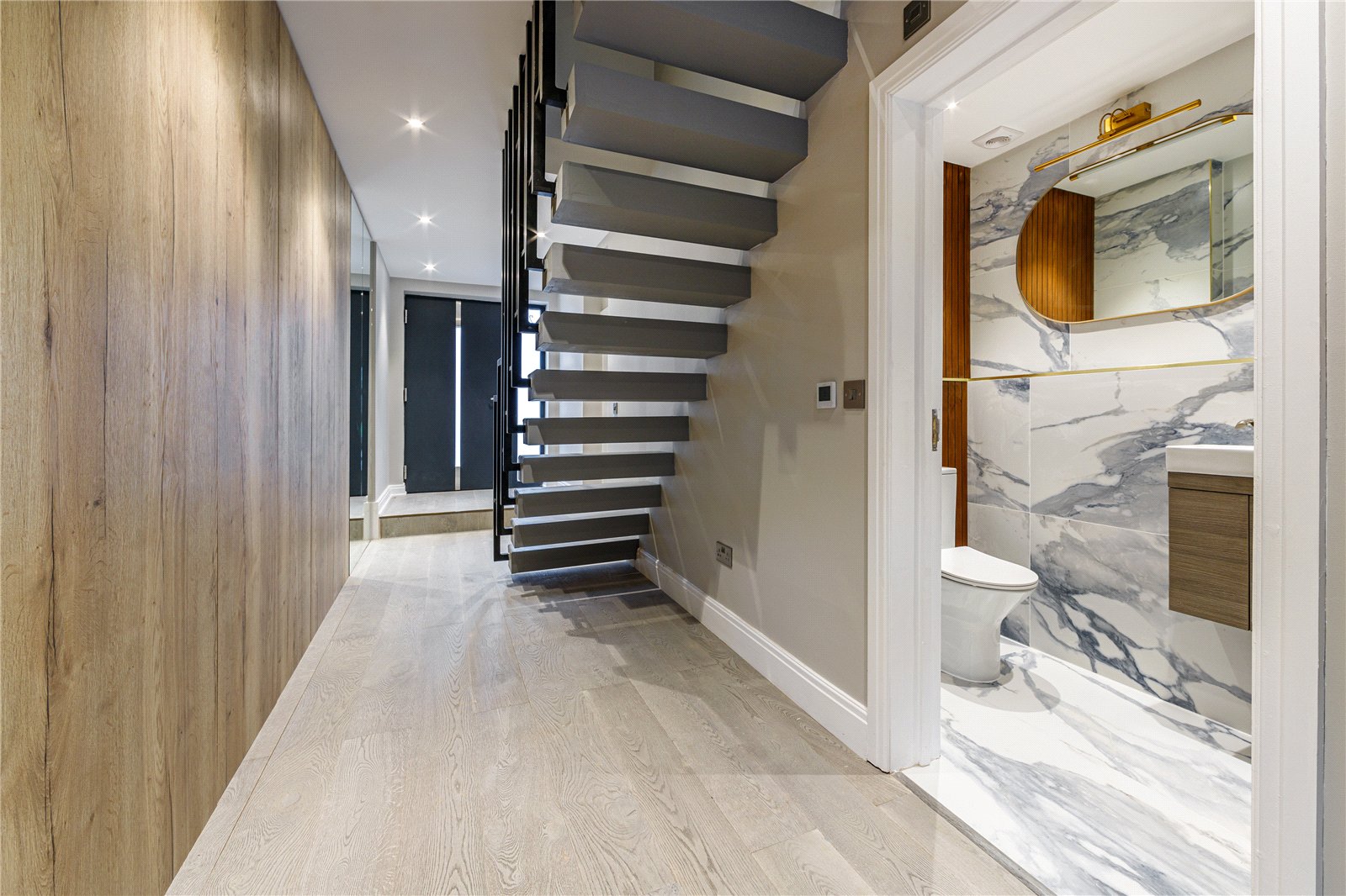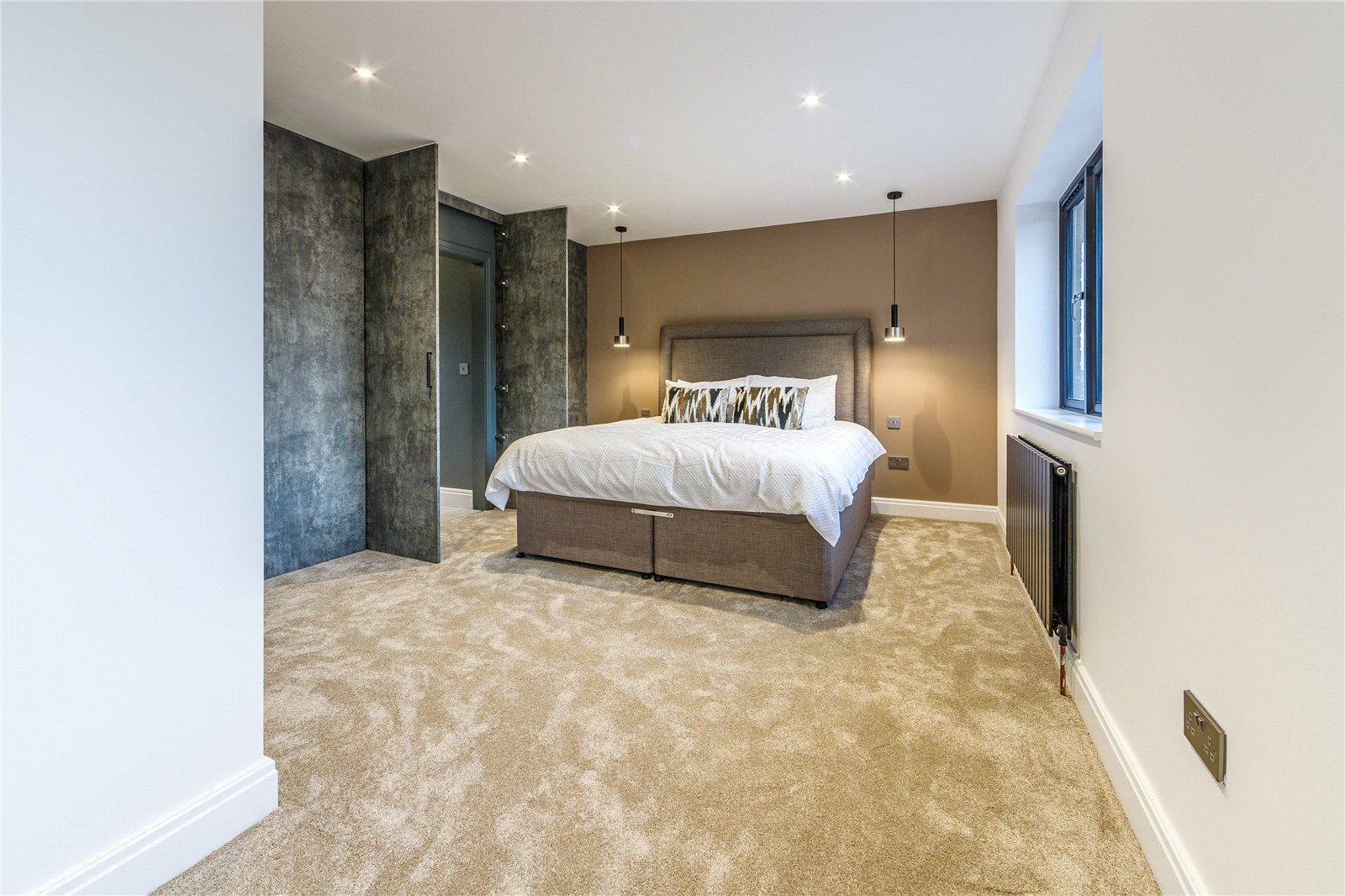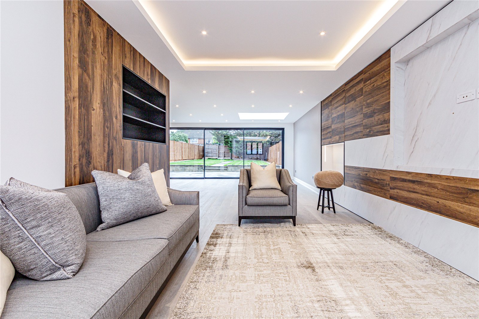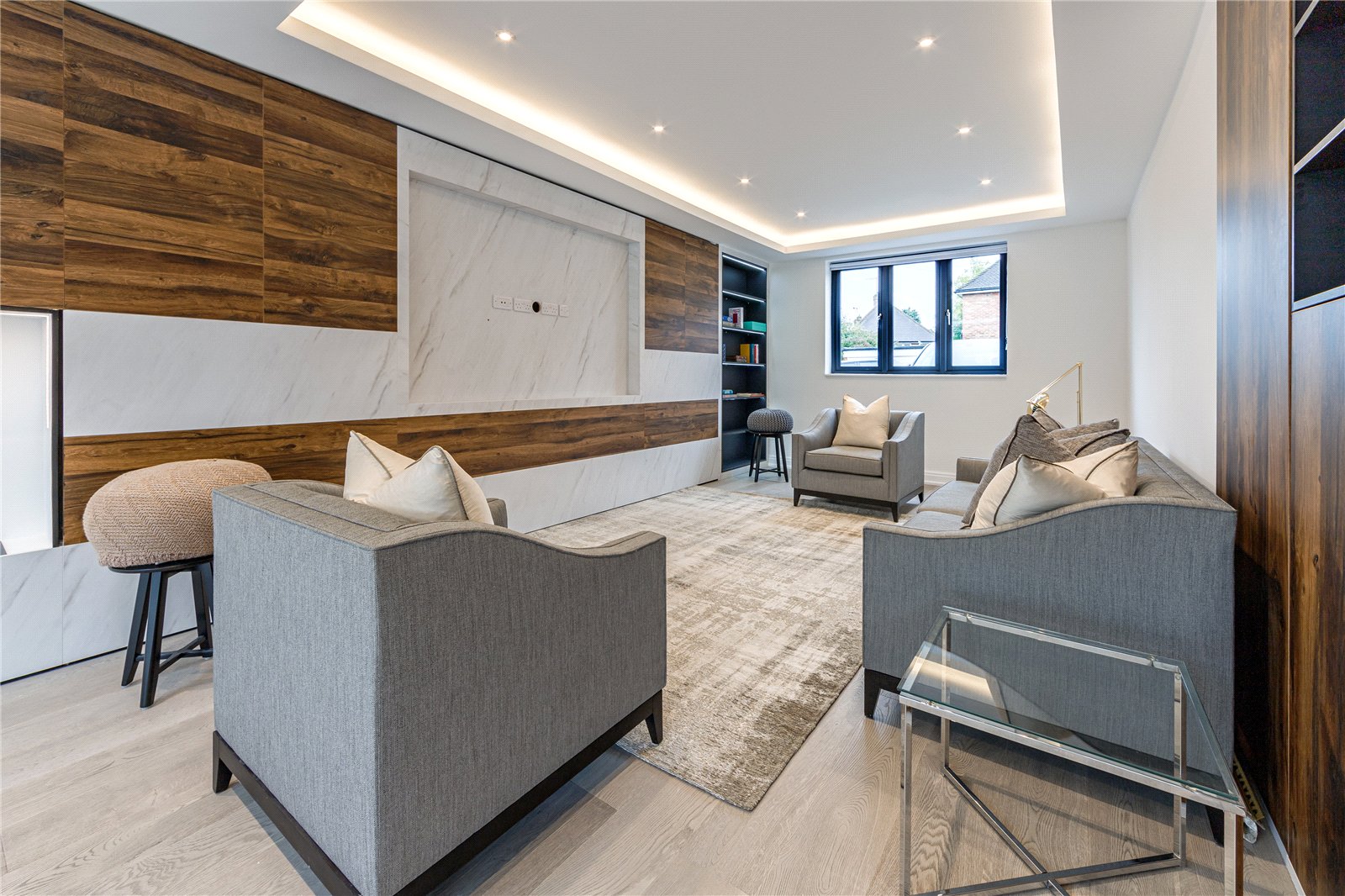 Upon entering this home, you are welcomed by the entrance hall leading on to the ground floor bedroom with Italian tiled en suite with underfloor heating, and then led onto the expansive open plan kitchen diner fitted with refined quartz worktops, kitchen island and Miele appliances. The kitchen and dining area then flows into the family living room, a great space fitted with a large media unit and bio ethanol fireplace. The garden can be accessed via anthracite sliding patio doors. The entire ground floor of this home is fitted with underfloor heating as well as the bathrooms within the property.