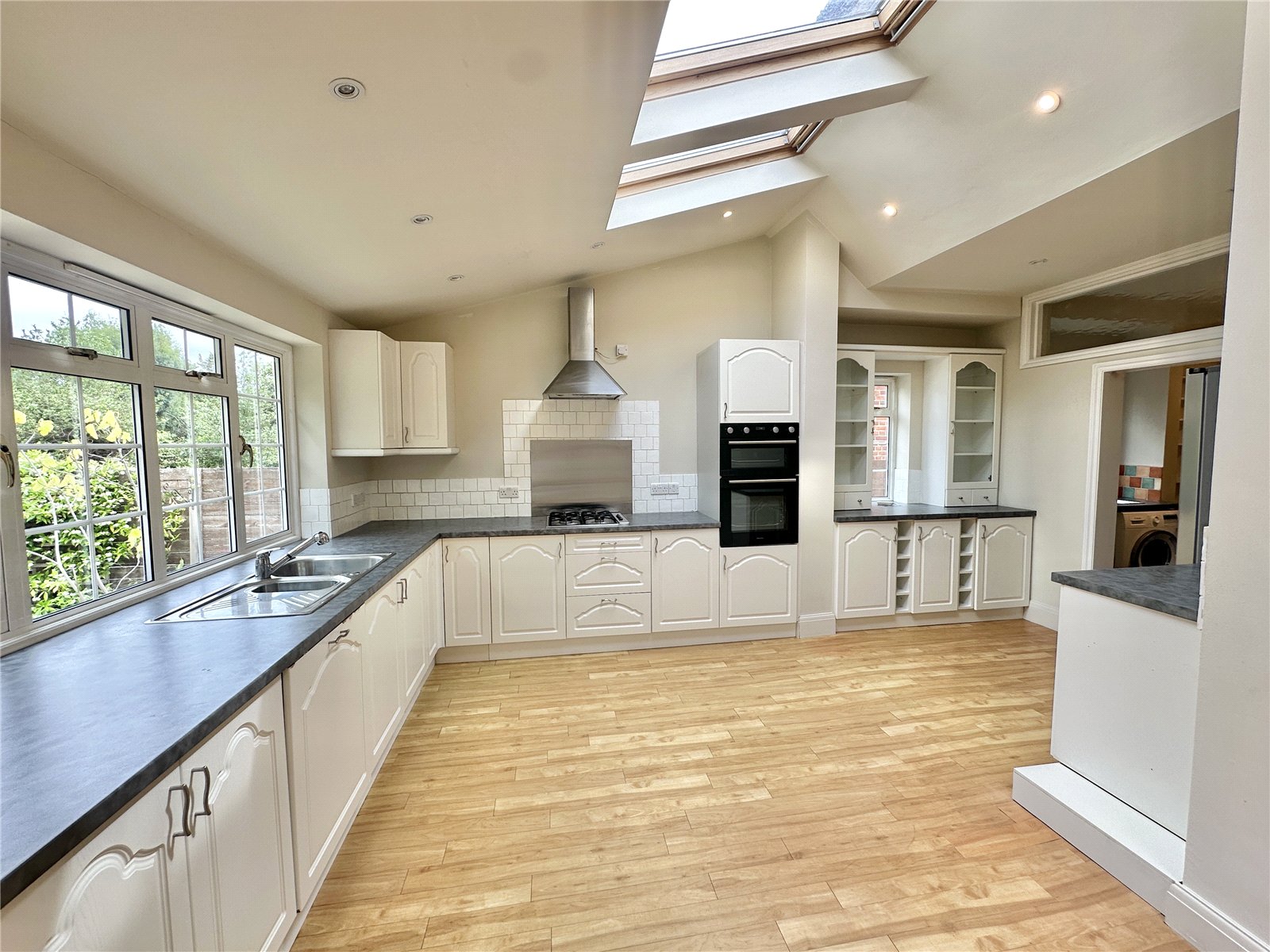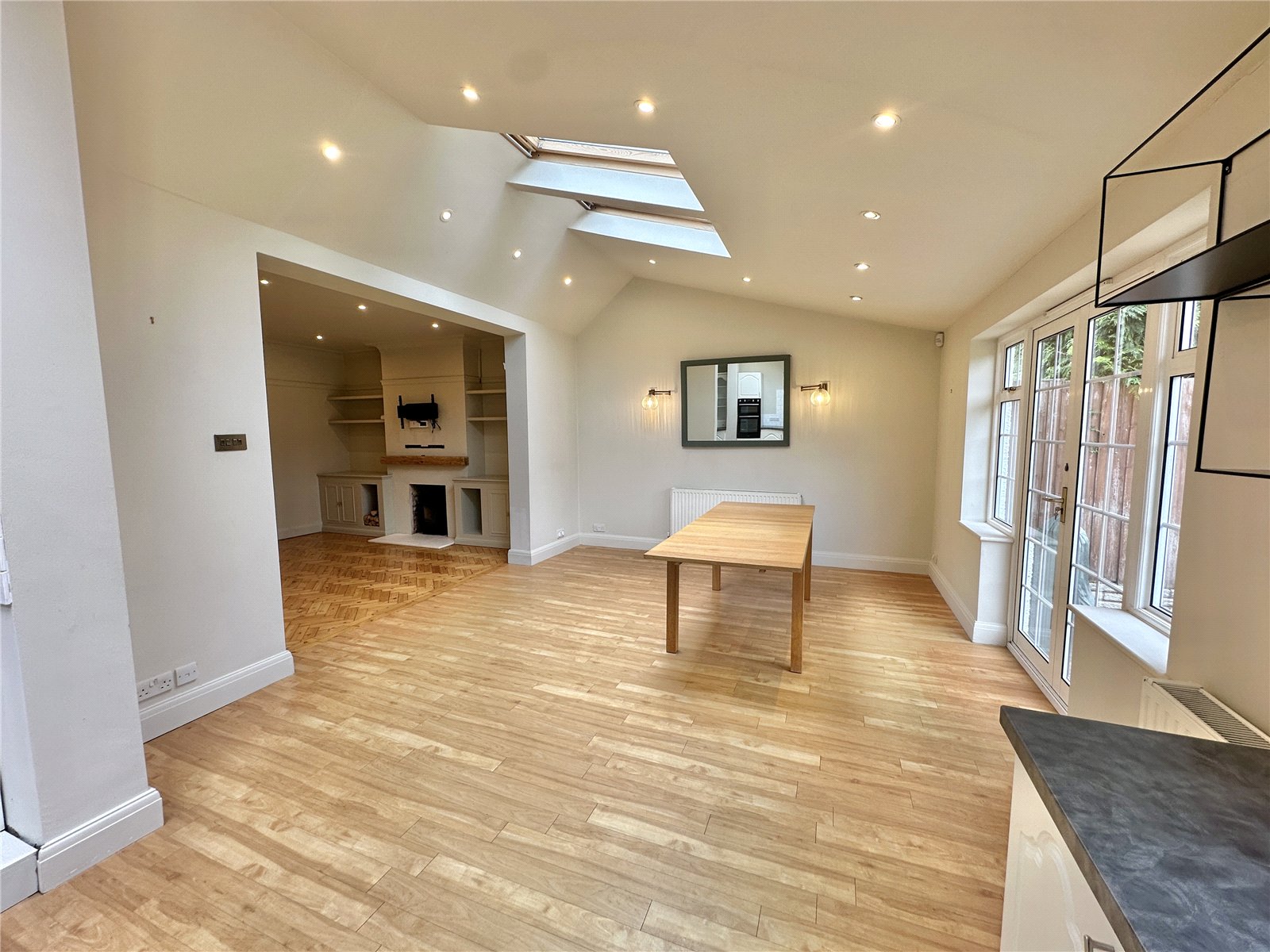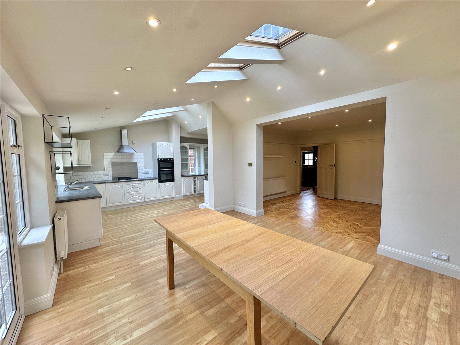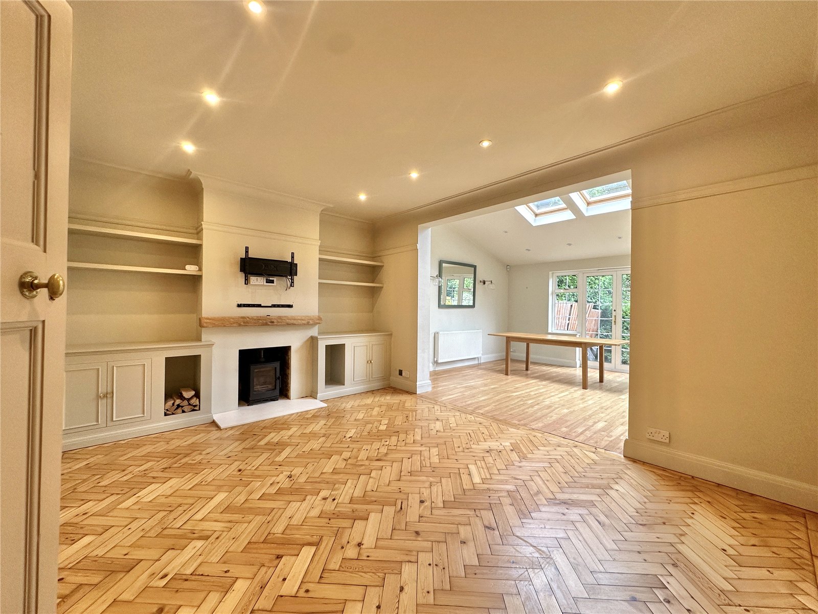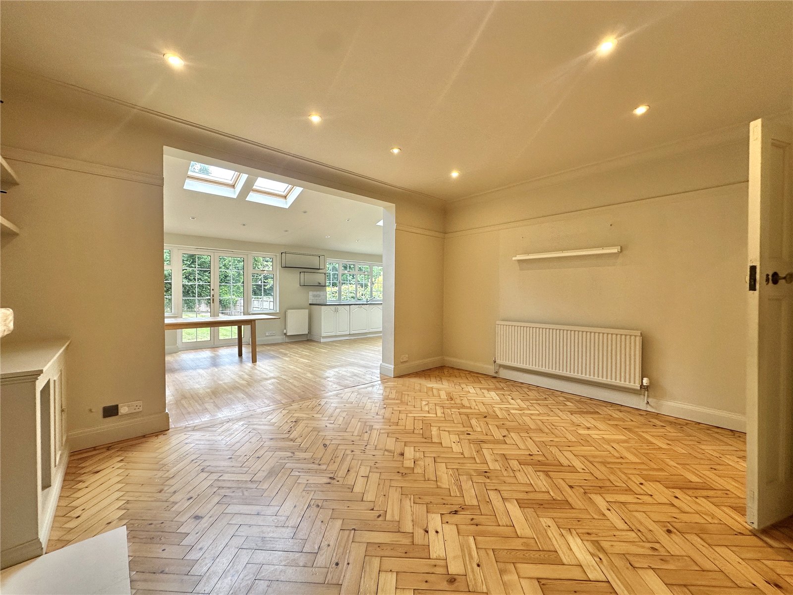 On the ground floor, the property welcomes you with a spacious entrance hall that leads to three large reception areas: a bay-fronted reception room, a comfortable TV room and an expansive kitchen and dining room that stretches nearly 26 ft in length, perfect for entertaining or everyday family life.