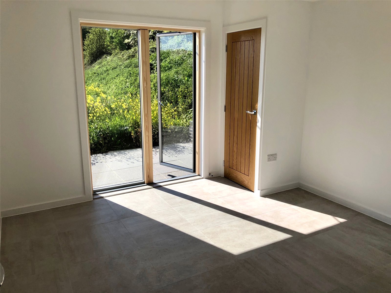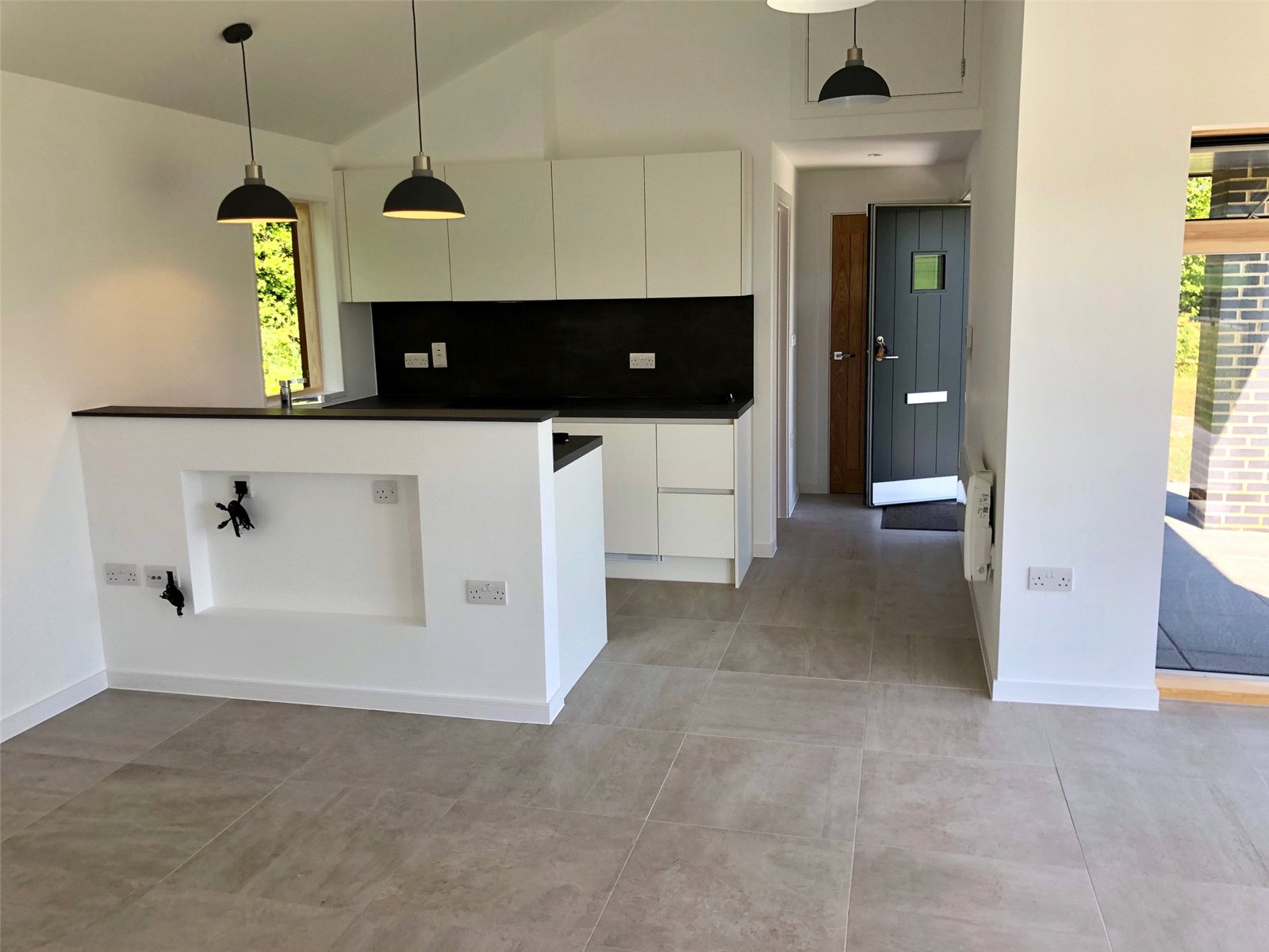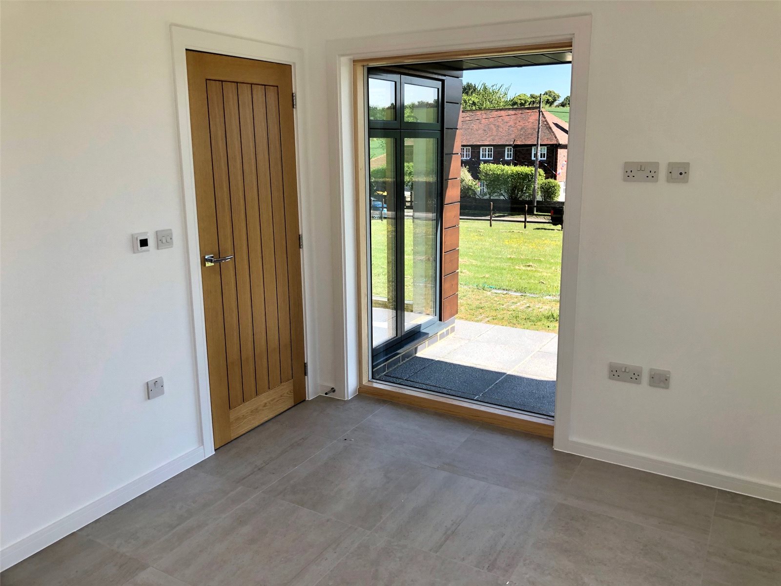 Door to front with square window. Double glazed Velvac full height window to side. Tiled flooring. Electrical cupboard.