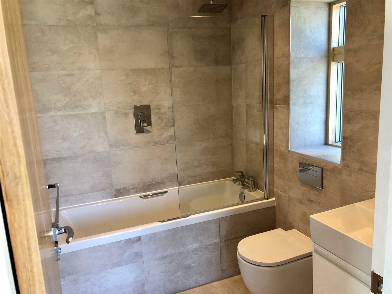 7' 2" x 5' 6" (2.18m x 1.68m) Double glazed Velvac frosted window to side. Tiled flooring. Plain ceiling with downlights. Panelled bath with shower screen and overhead shower. Low level flush W.C. Wash hand basin and vanity. Tiled walls. Wall mirror with lights.