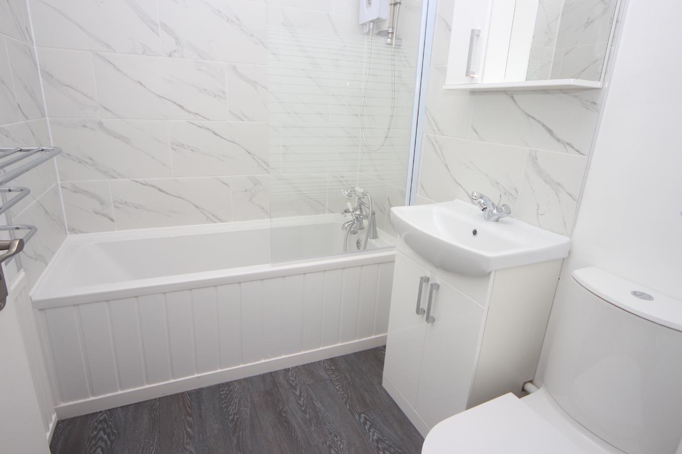 Bathroom - 2.2m x 1.7m (7'2" x 5'6" ) - having newly fitted white suite including panelled bath with electric shower over and screen, low level w.c., vanity with wash hand basin, ceramic tiled splashbacks, extractor fan, vinyl flooring and heated towel rail.