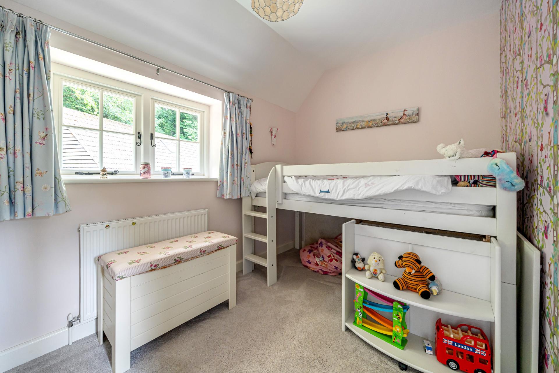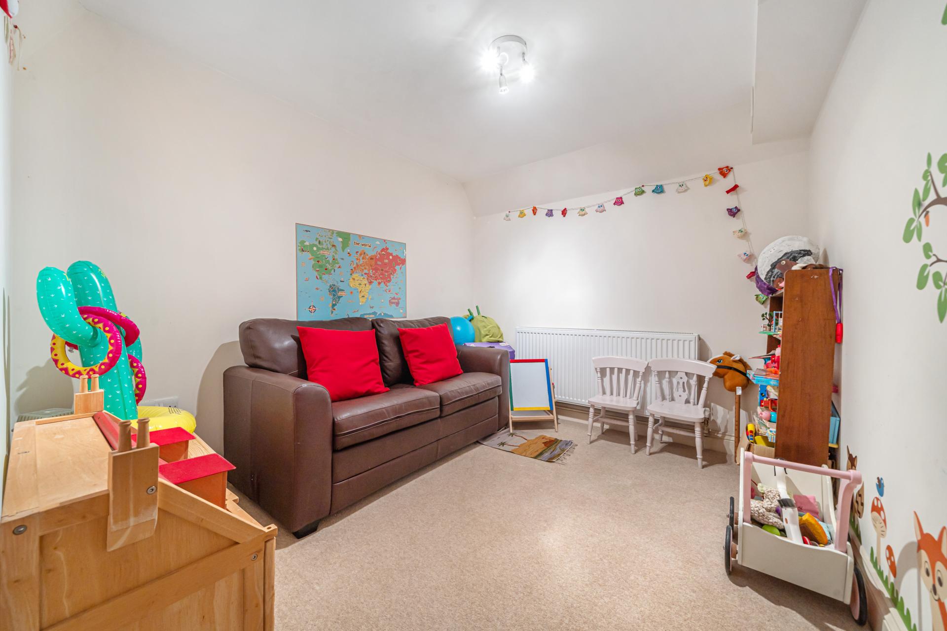 The first floor unveils four bedrooms and two bathrooms, showcasing a master bedroom suffused with light and character, complete with Juliette Balconies offering stunning garden views. The lower ground floor provides versatile living spaces, presenting a Guest Bedroom, a Playroom, a Utility Room, and a multifunctional area, perhaps destined to be your private cinema or gym. The house is adorned with gas heating and delightful fireplaces.
