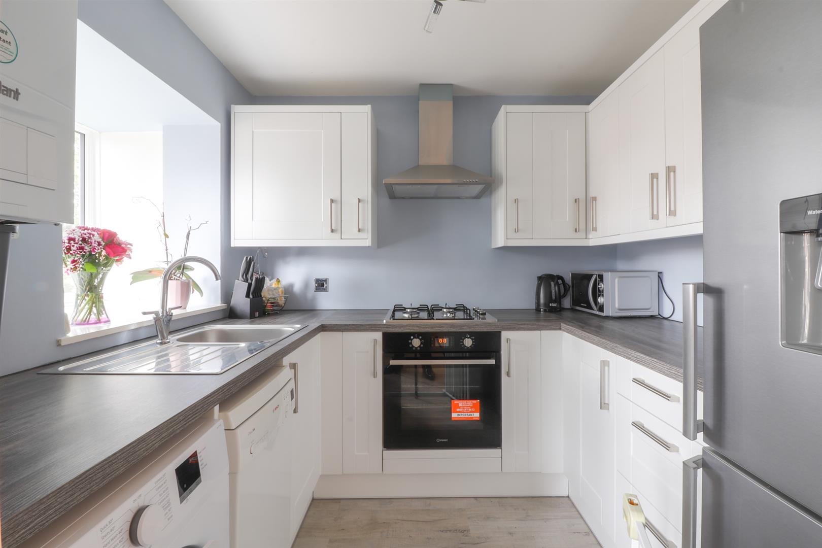 Re-Fitted Kitchen - 2.39m'' x 2.21m'' (7'10'' x 7'3'') - Front aspect uPVC double glazed bay window. Range of wall and base mounted units. Work surfaces. Inset single drainer stainless steel sink unit with mixer tap over. Built in gas four ring hob. Extractor hood over. Built in oven below. Plumbing for washing machine and dishwasher. Wall mounted gas central heating boiler. Space for fridge/freezer. Laminate flooring.