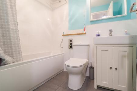 Re-Fitted Bathroom - 2.18m'' x 1.73m'' (7'2'' x 5'8'') - White suite comprising panel enclosed bath. Wall mounted hand held shower and wall mounted Rainfall shower head. Shower. Low level W.C. Wash hand basin. Heated towel rail. Extractor fan.
