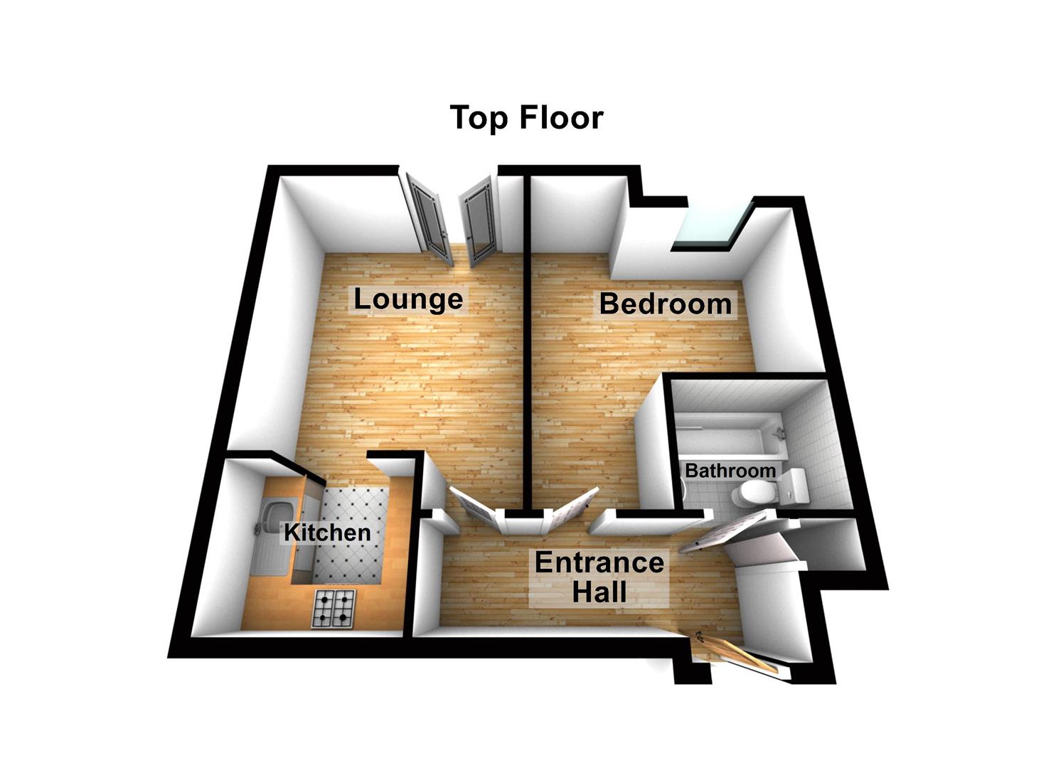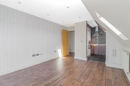 Living Room - 4.65m x 3.45m max (15'03 x 11'04 max) - Front aspect uPVC double glazed double doors to Juliette balcony. Side aspect Velux window. Recessed ceiling spotlights. Wooden floor. Radiator. Open to: