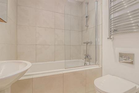 Bathroom/W.C. - 1.68m x 1.57m (5'06 x 5'02) - Tiled bath panel with mixer tap and shower attached over. Shower screen. Tiled floor. Toilet with concealed cistern. Wash hand basin. Recessed ceiling spotlights. Chrome heated towel rail. Extractor fan.
