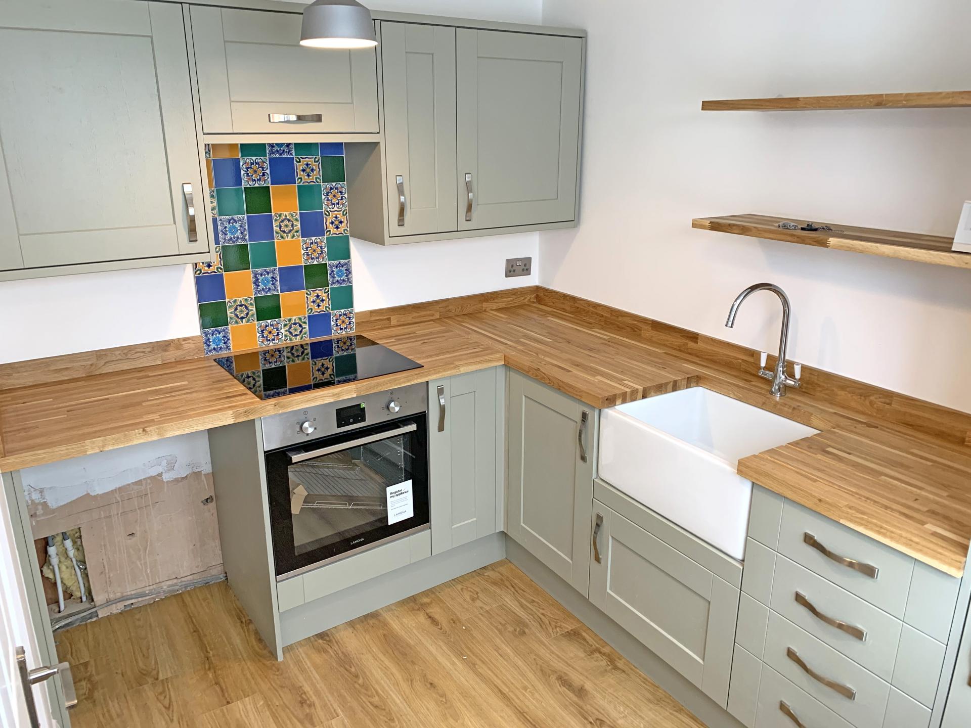 2.85 (9’4) x 2.18 (7’2) An attractive range of fitted cupboards in a pale green shaker style, stainless steel handles, ceramic Belfast sink with mixer tap and solid Oak’ butchers block effect’ work surfaces with up stands. Built in electric oven and electric hob with cooker hood over and space for an under counter fridge. Wood effect flooring, Oak shelves, Window to front aspect.