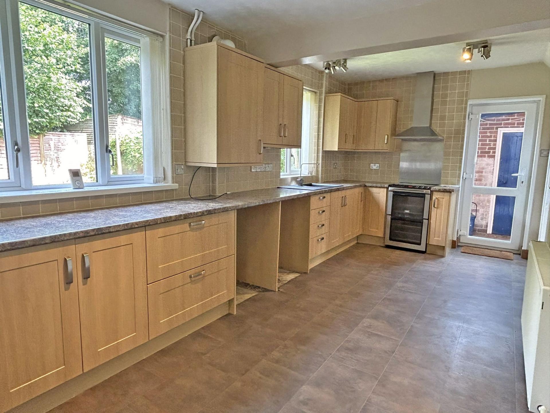 5.7m x 2.6m (18’11 x 8’07) A well proportioned, open plan space. Two uPVC double glazed windows with a pleasant outlook over the rear garden. A fitted kitchen comprising a range of floor and wall mounted units, oak effect shaker style drawer and door fronts with stainless steel handles, co-ordinating work surfaces and tiled splashbacks. Sink unit with draining board and mixer tap. Free standing Zanussi gas double oven and hob. Stainless steel splashback and extractor over. Space for a freestanding washing machine, dishwasher and fridge/freezer. Concealed wall hung gas fired Combi boiler. Radiator. Ceiling lights with directional downlighters. Fitted blinds. Tile effect lino floor covering. Door to pantry with cold shelf, shelves and vent to the exterior. uPVC double glazed back door which provides access to the side and rear of the property.