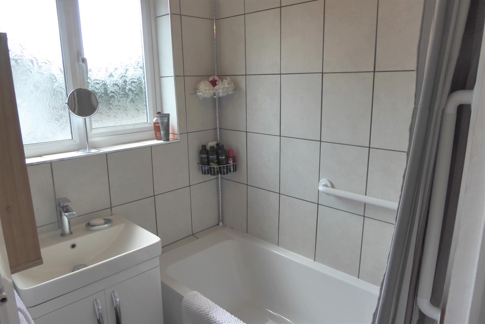 Bathroom - Panel enclosed bath with mixer tap and shower attachment, hand wash basin and vanity unit, part tiled walls, airing cupboard housing tank, vinyl flooring, side aspect double glazed window.