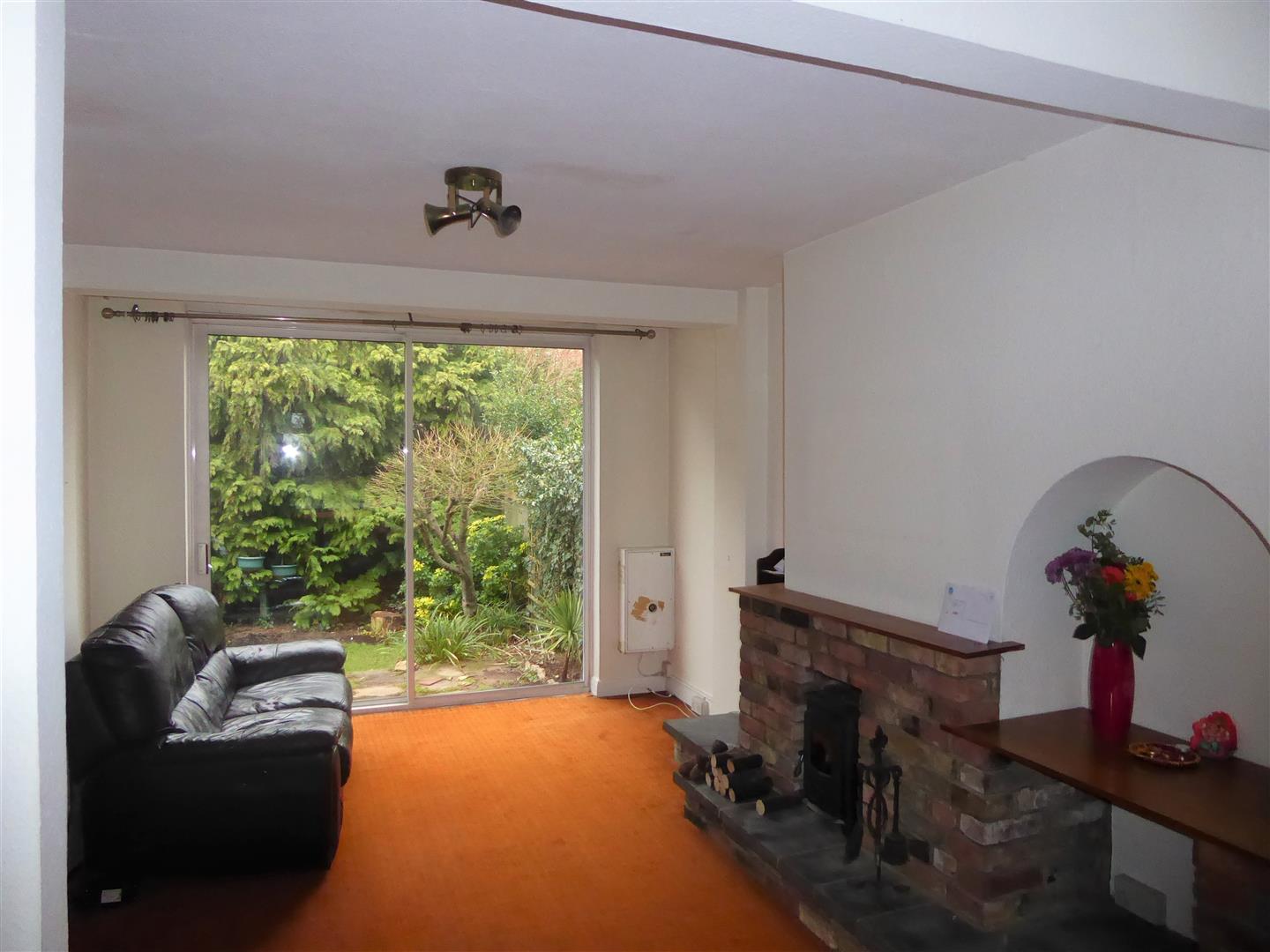 Through Lounge - Front aspect double glazed bay window, rear aspect double patio door, feature brick fireplace, radiator, carpet.