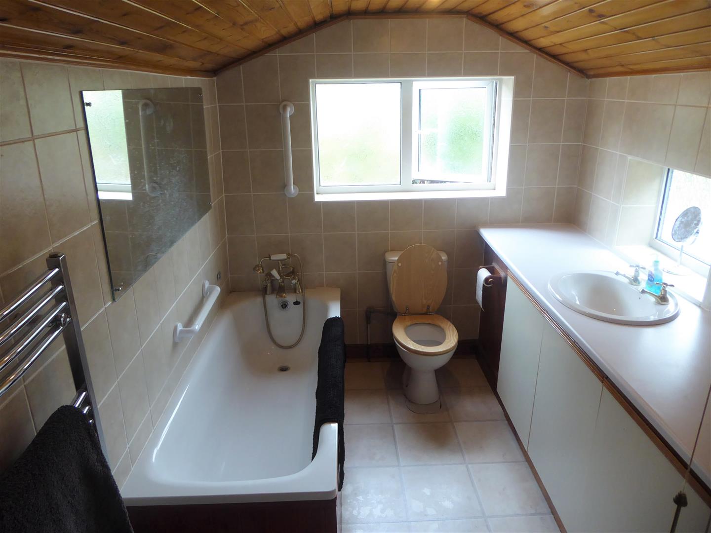 Family Bathroom - Panel enclosed bath with mixer tap and shower attachment, wash hand basin with storage cupboard below, low level w/c, tiled walls, heated towel rail, side and rear aspect double glazed windows.