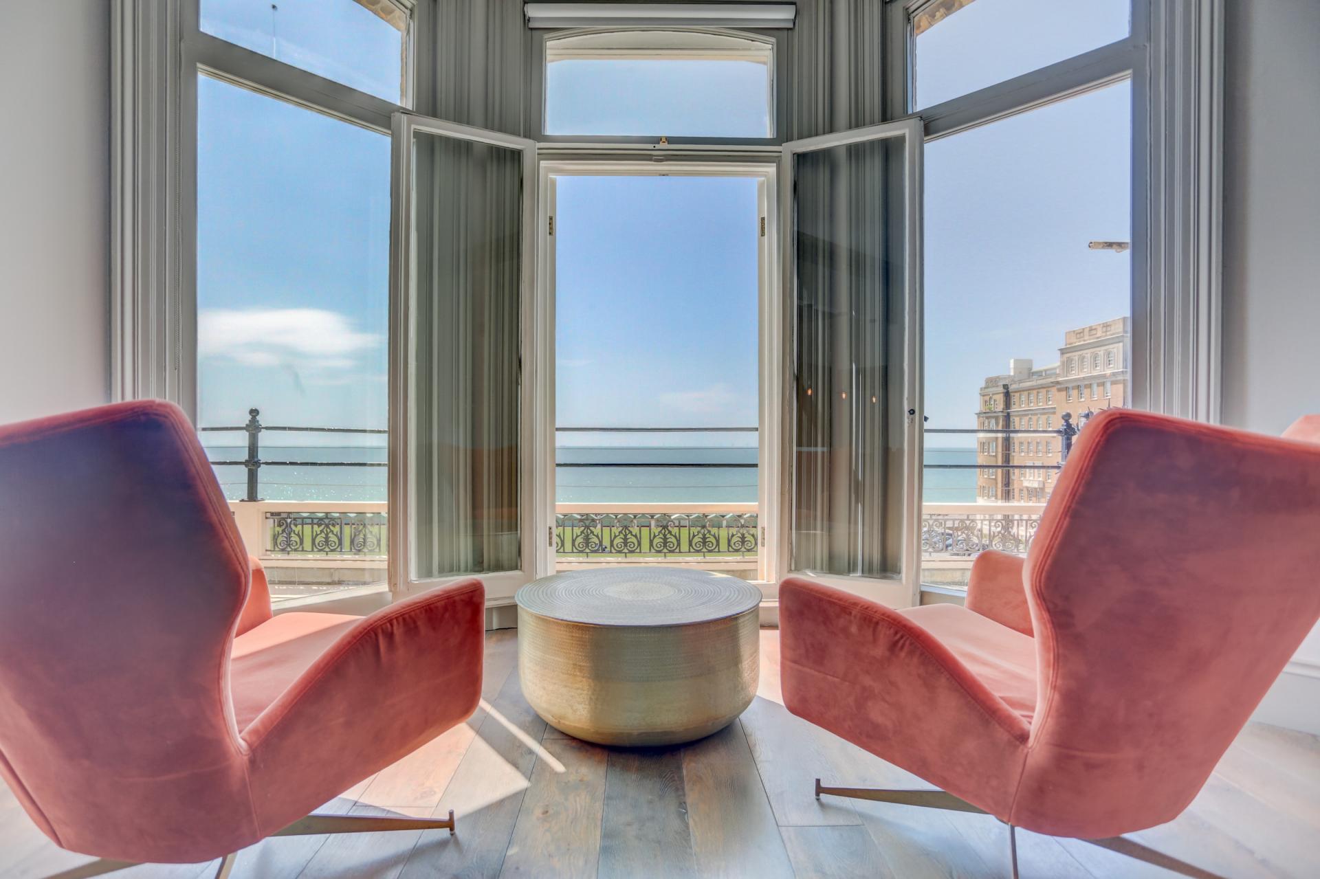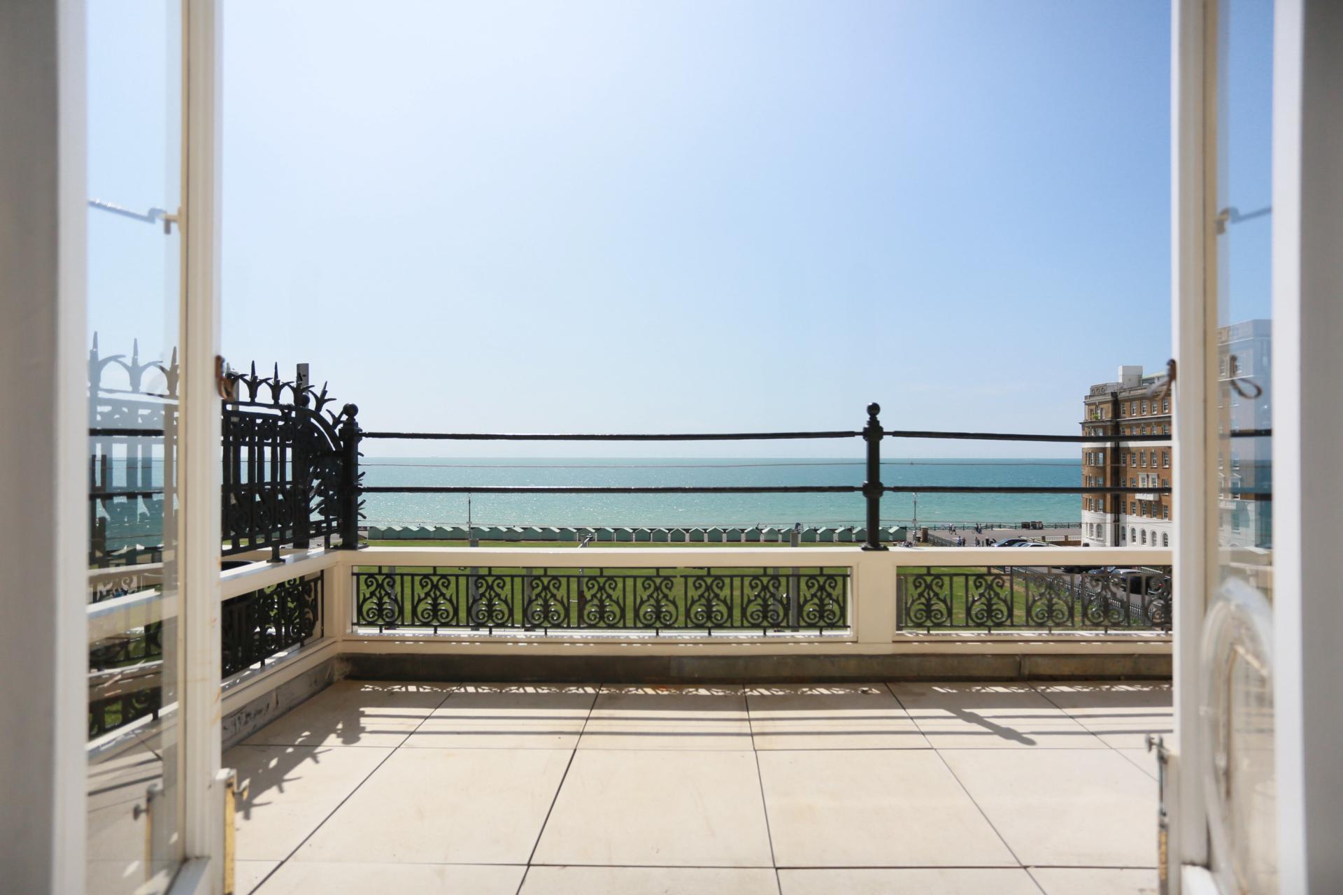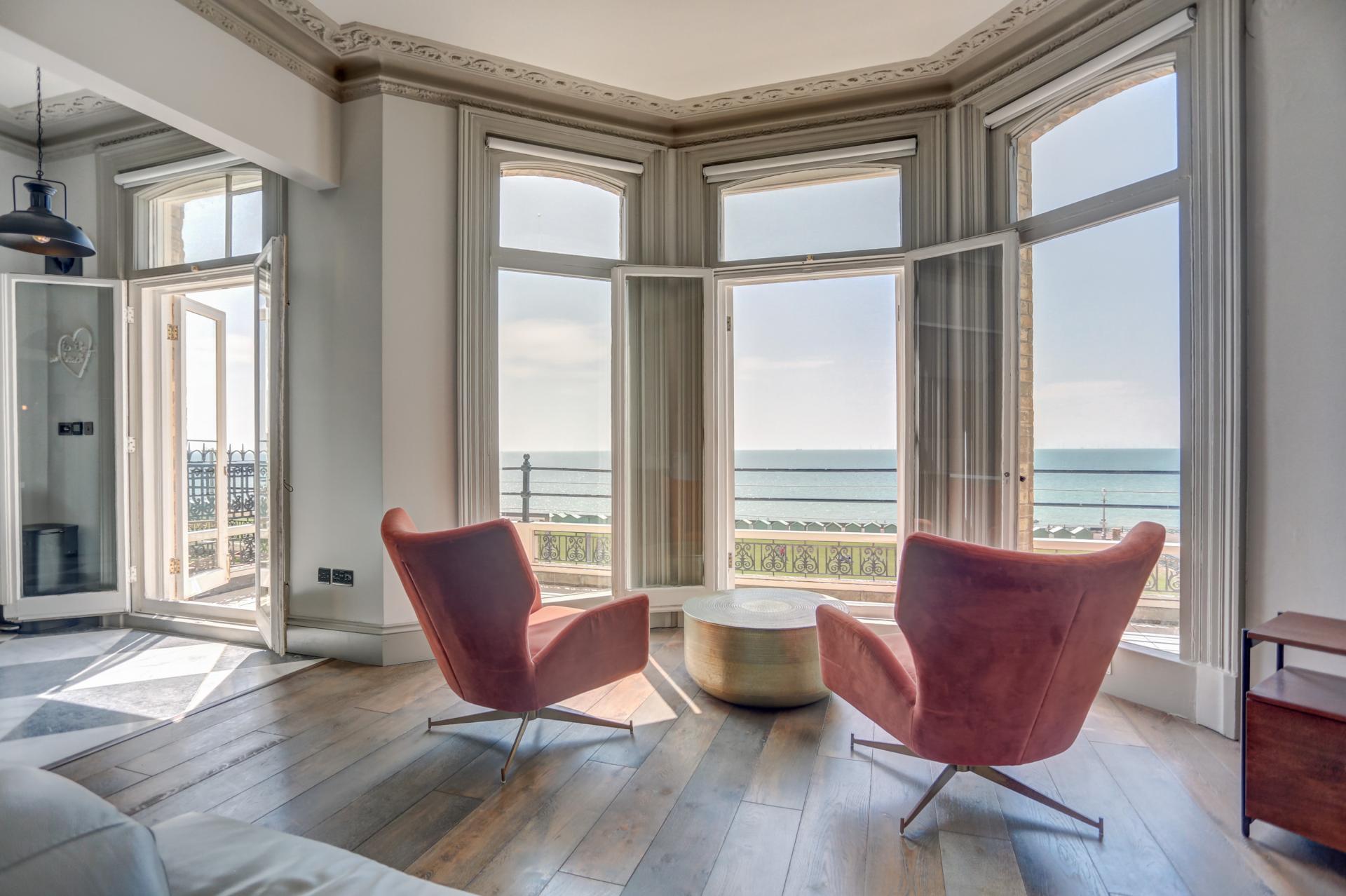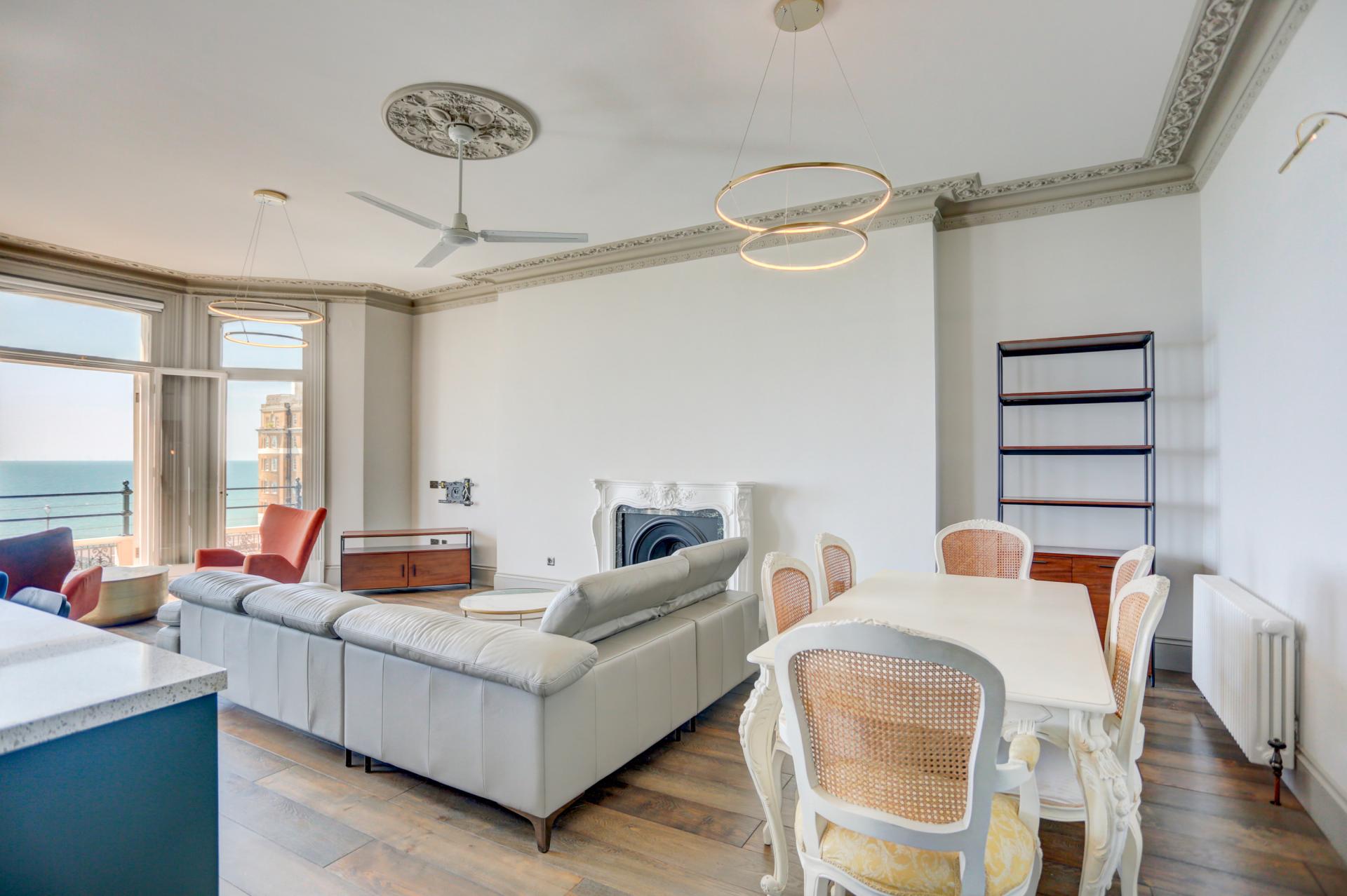 Floor-to-ceiling windows and French doors open onto a generous south-facing balcony with wonderful views across the Channel. The living and dining space features dark wooden flooring, decorative cornicing, and a ceiling rose, with additional French doors leading to the balcony.