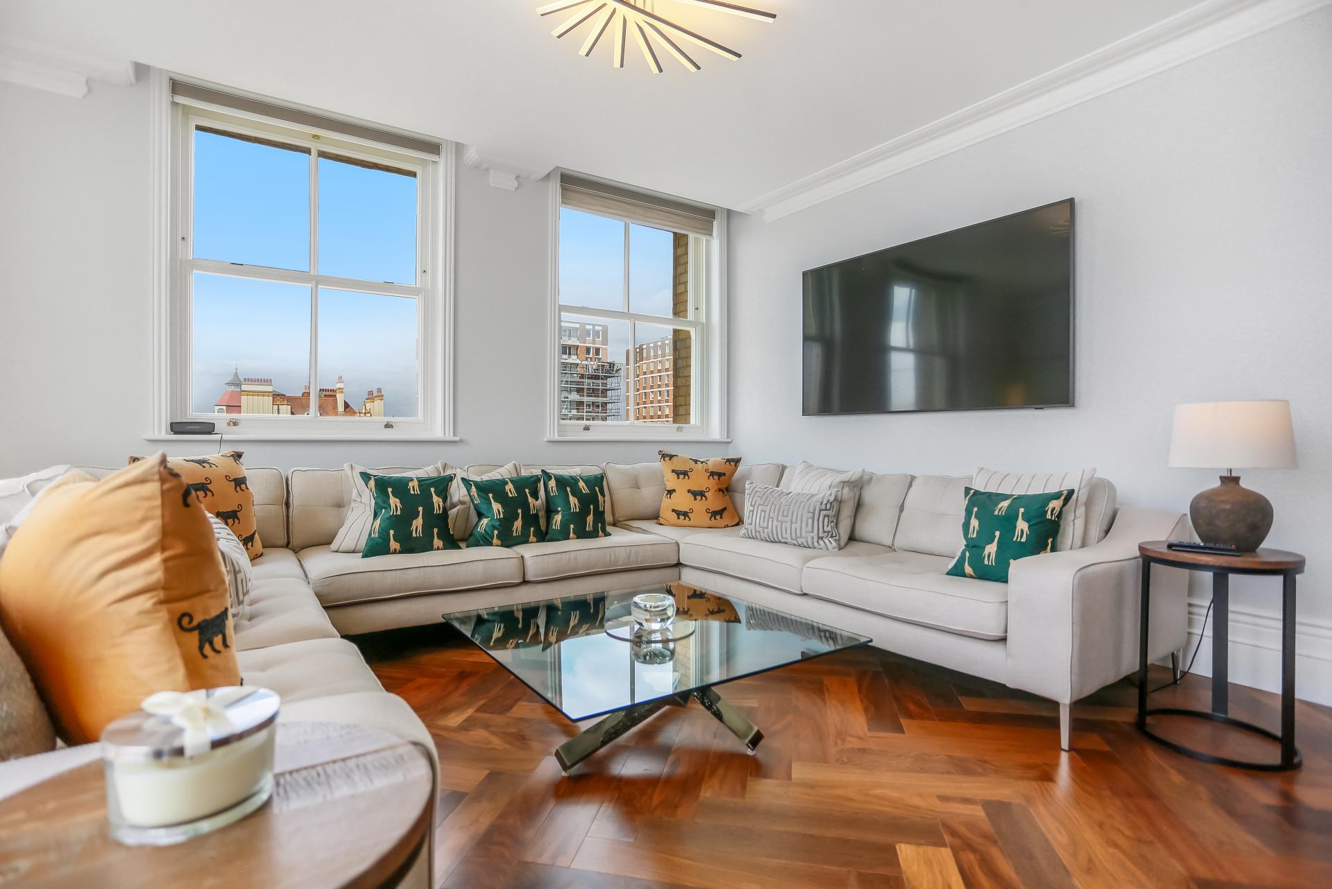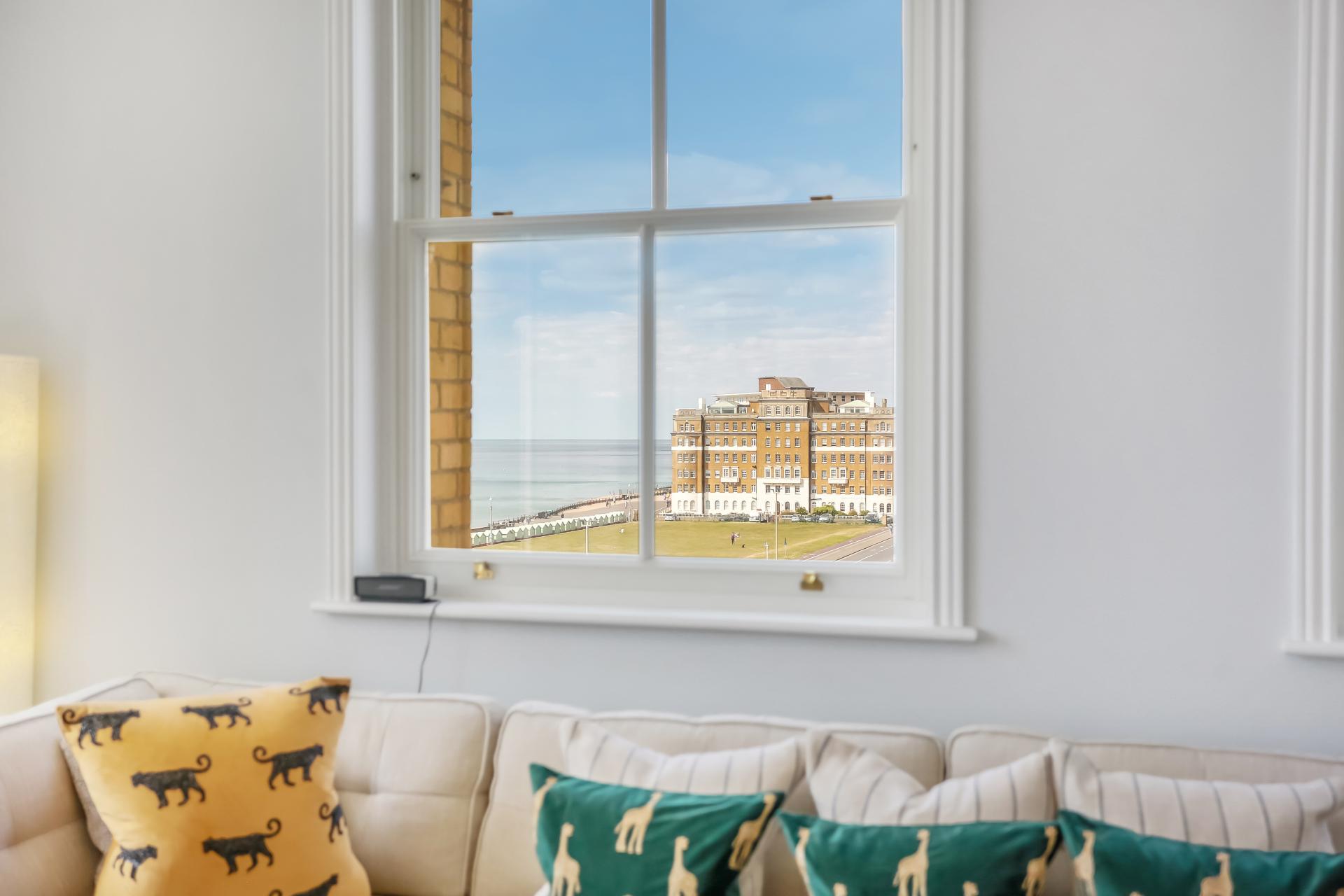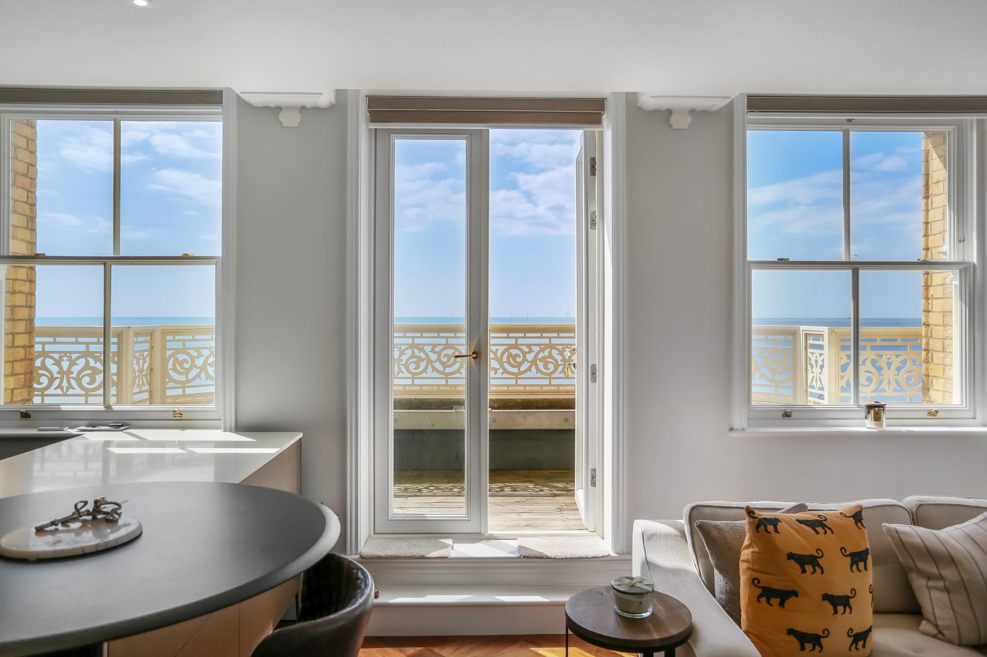 The apartment itself is beautifully presented and comes fully furnished to a high specification. The bright south-facing lounge features remote-control blinds and patio doors opening onto a private terrace, offering panoramic views stretching east and west along the coast, across Hove Lawns, and out to sea.
