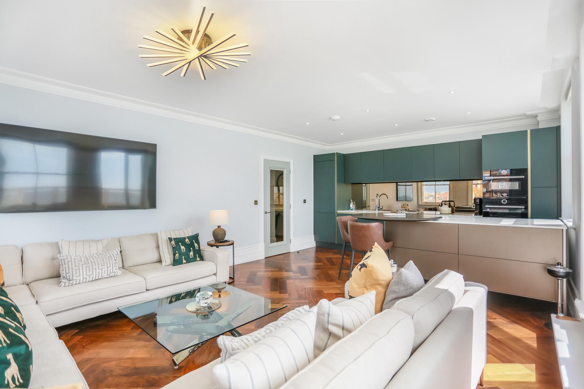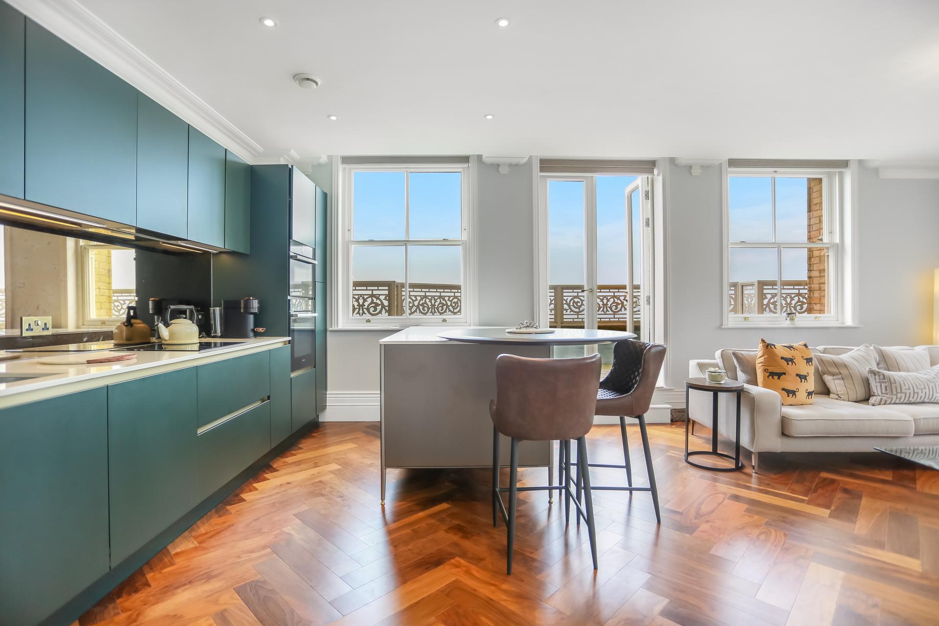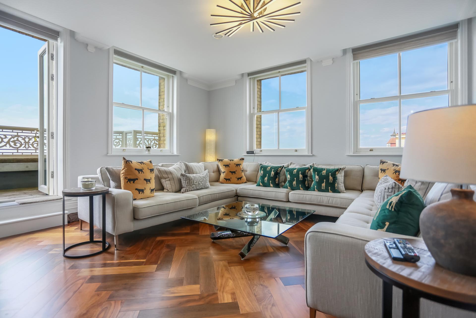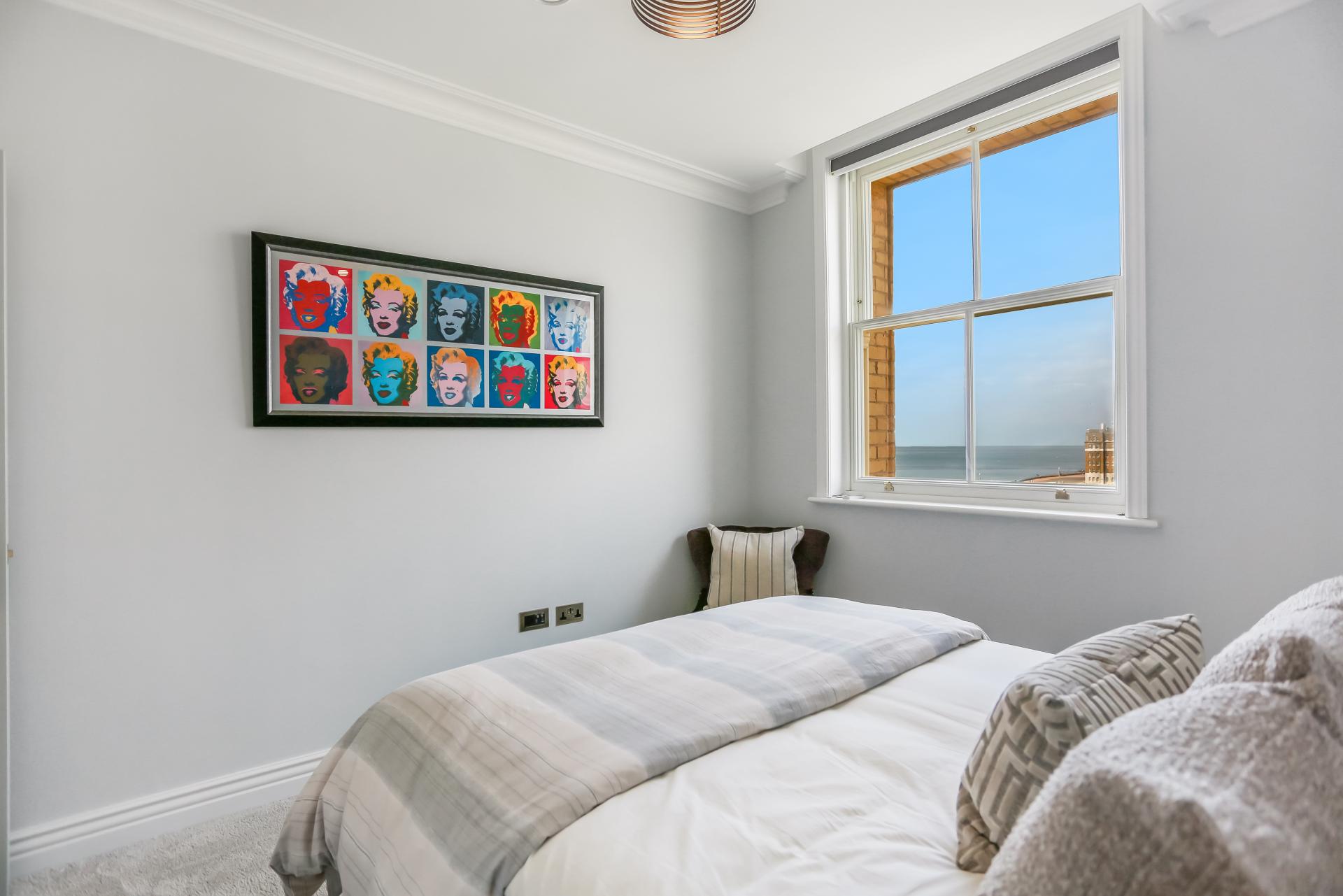 The apartment itself is beautifully presented and comes fully furnished to a high specification. The bright south-facing lounge features remote-control blinds and patio doors opening onto a private terrace, offering panoramic views stretching east and west along the coast, across Hove Lawns, and out to sea.