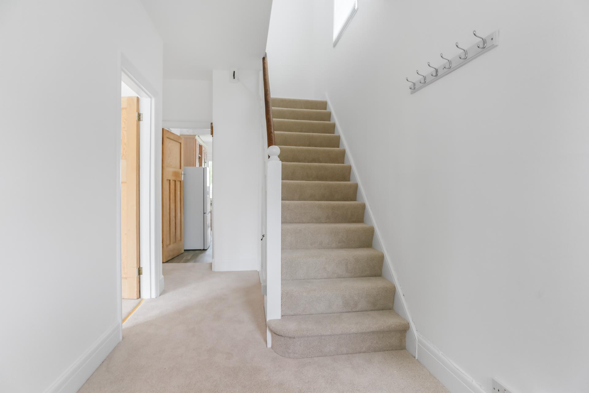 Upstairs, there are two generously sized double bedrooms with built-in wardrobes, along with a third single bedroom that could also be used as a home office. The family bathroom includes a bath with overhead shower, and there is a separate WC for convenience.