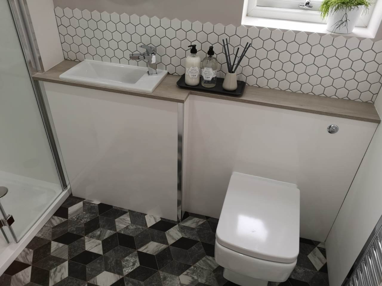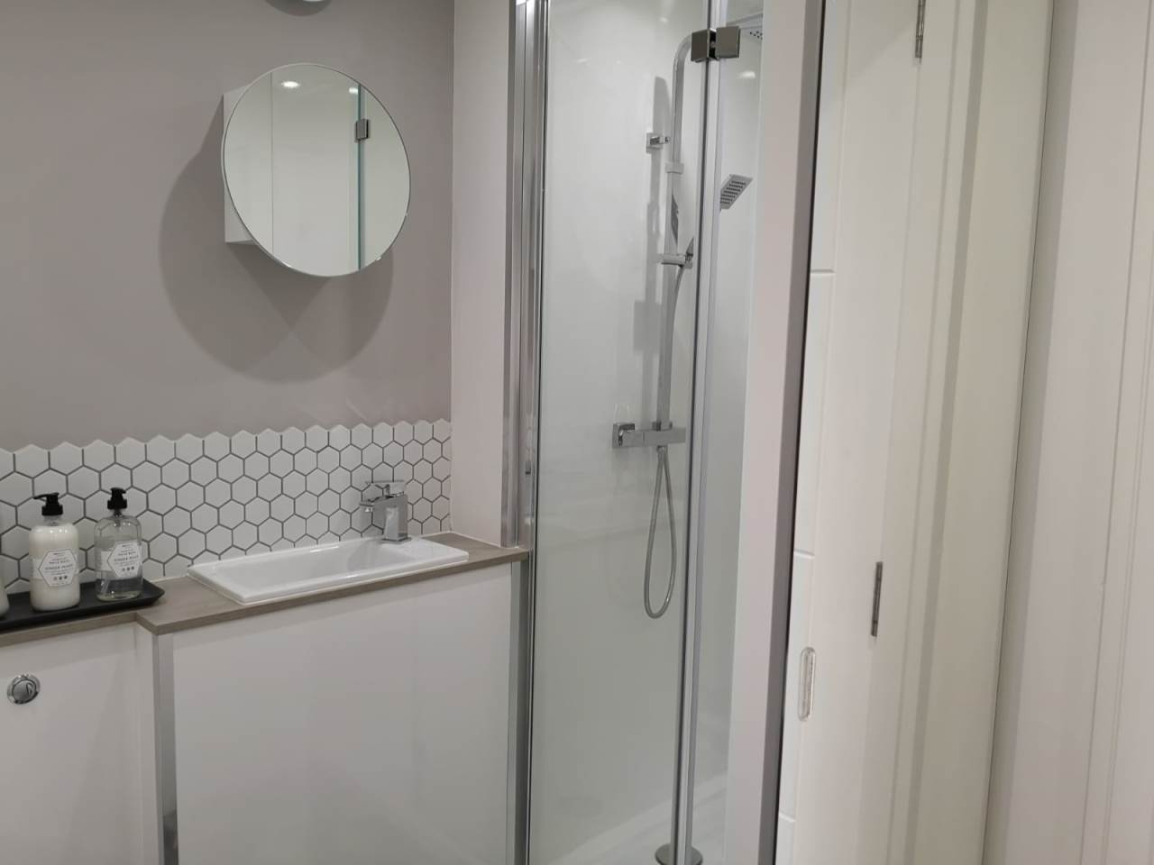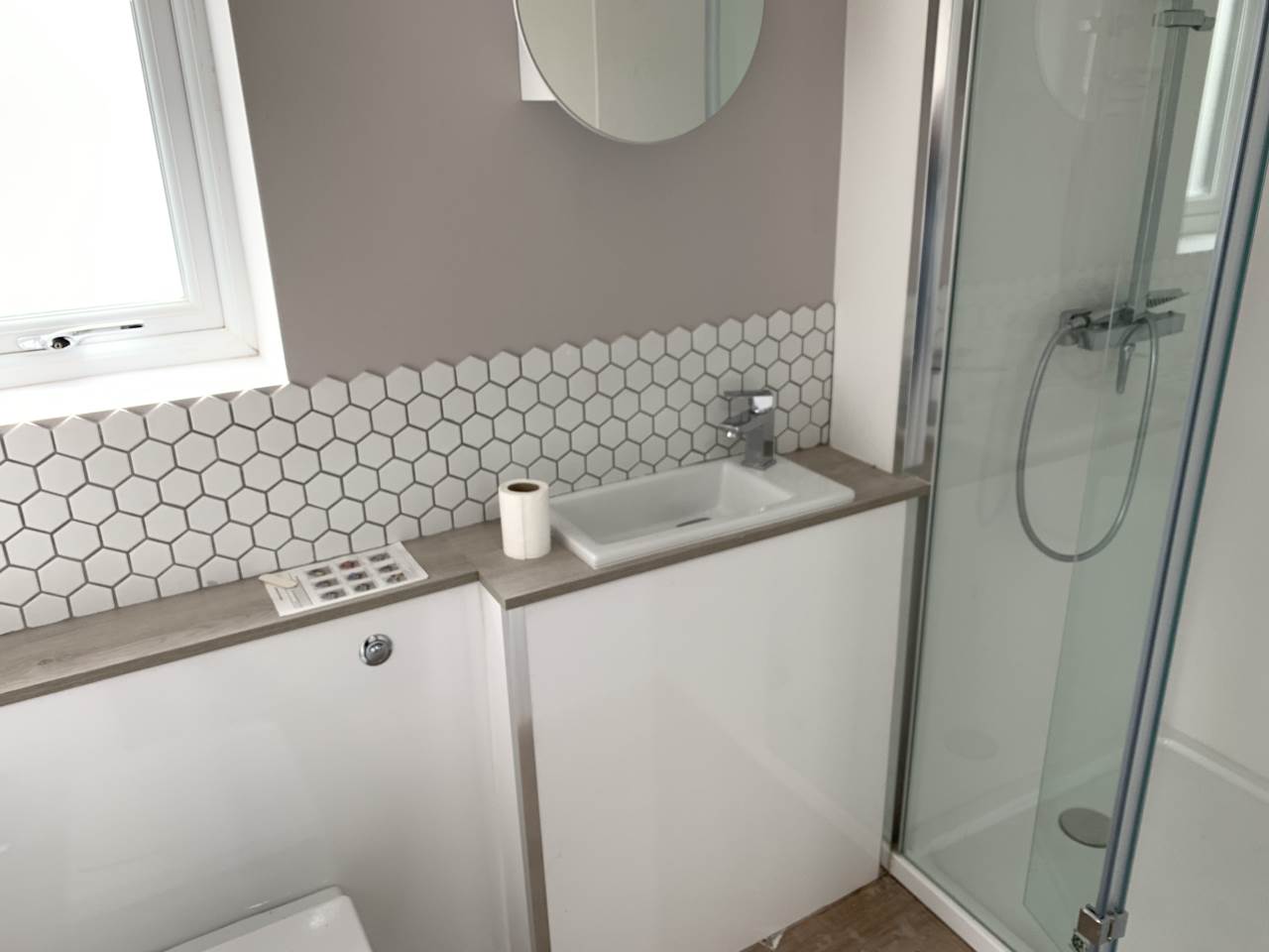 Mirrored doors lead into the en-suite bathroom which is fitted with an exceptional shower cubicle with power shower, wc and wash basin.