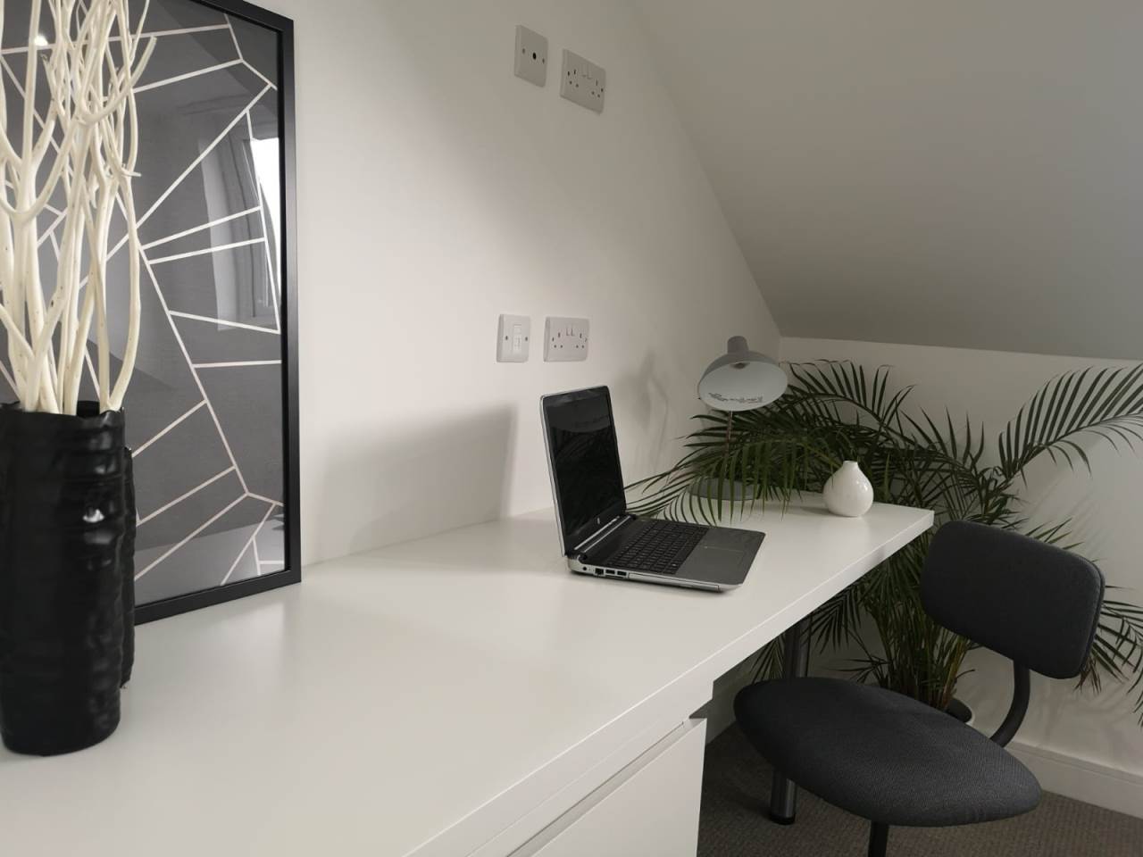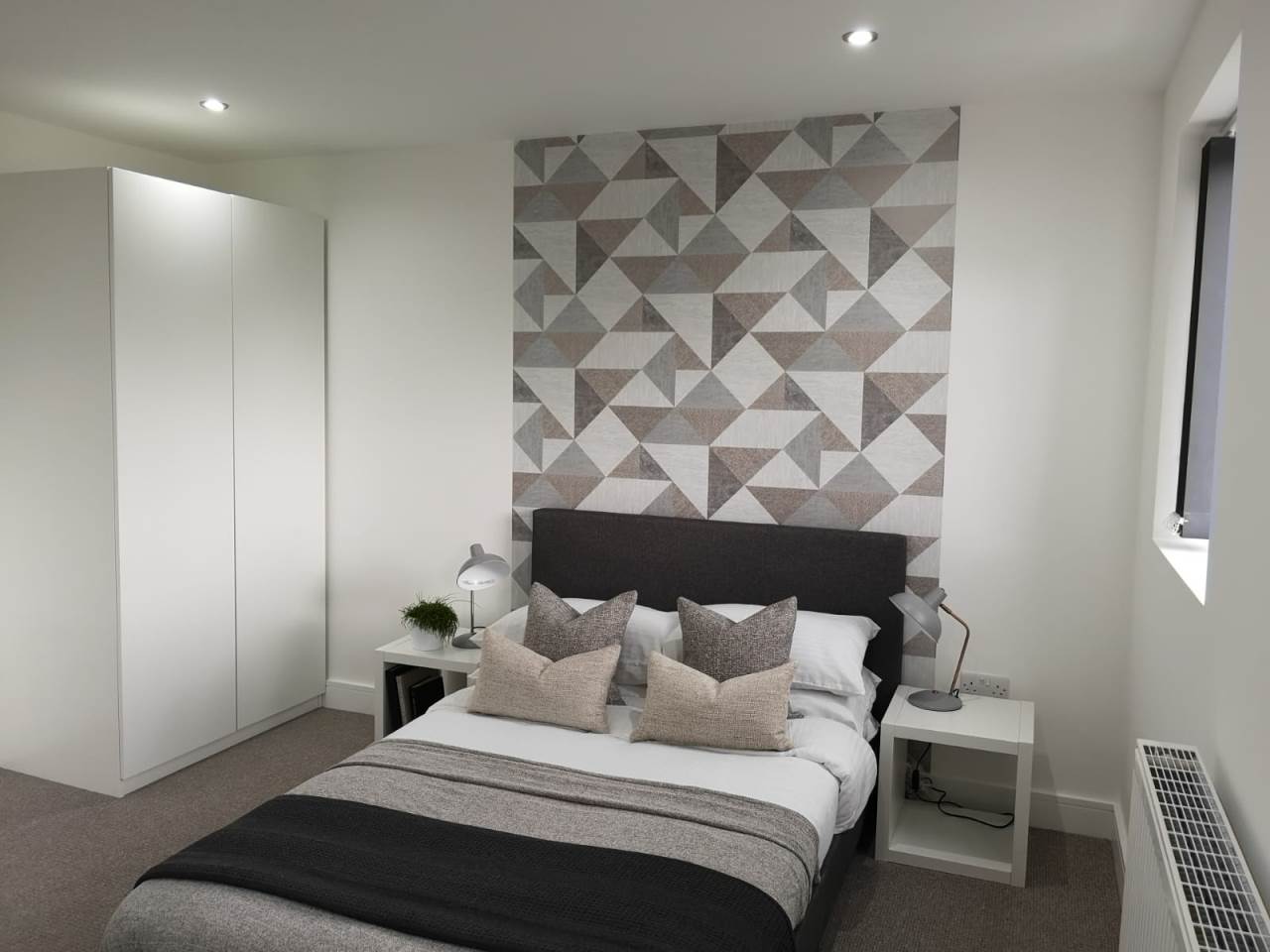 This second floor bedroom provides luxury living being furnished with a double bed, integrated wardrobe, desk and chair.