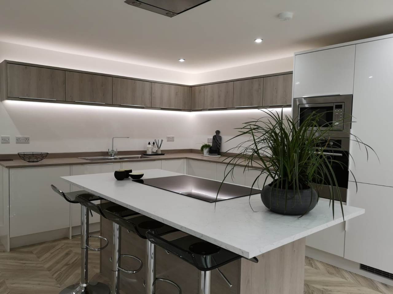 Stylish designer style kitchen fitted with fridge/freezer, washing machine, integrated oven, dishwasher, washer, microwave, 43" TV, hob and remote controlled extractor. There is a stunning central island providing a hob and remote control extractor fan and breakfast bar with stools.