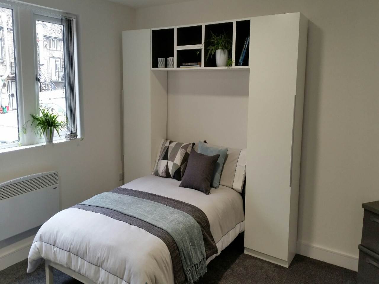 The bedroom area includes a double bed, desk, chair and built-in wardrobe and shelving units.