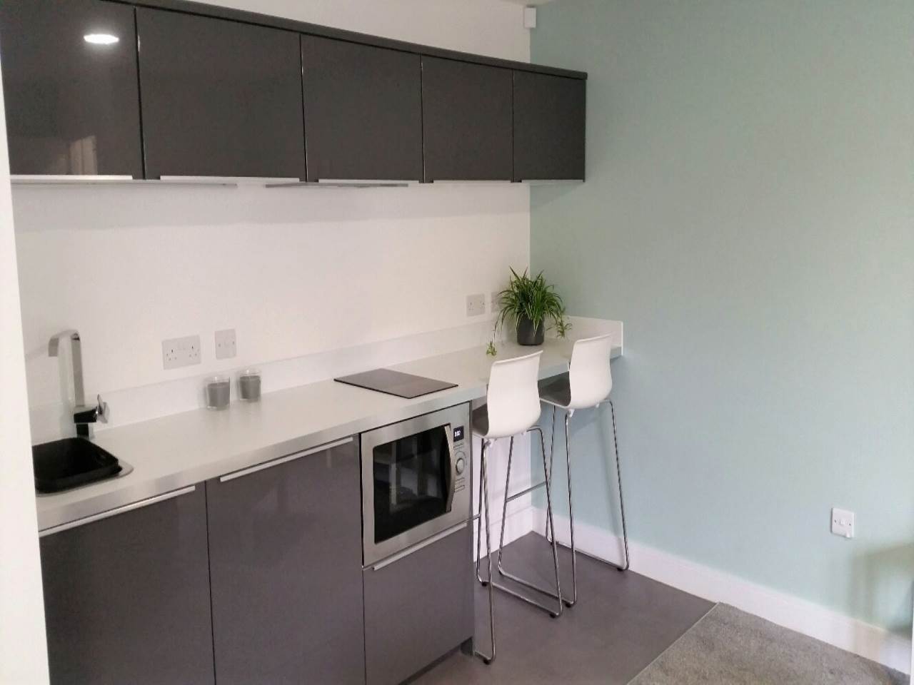 Stylish private kitchen area with integrated oven, hob, microwave and extractor fan.
