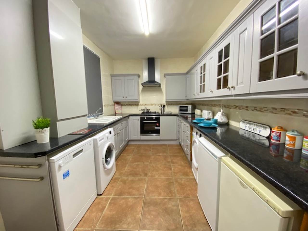 Modern fitted integrated kitchen including ample storage space, oven, hob, extractor, 2 x microwaves, 3 x fridge/freezers, washing machine, dryer, dishwasher. Also includes a breakfast bar with stools.