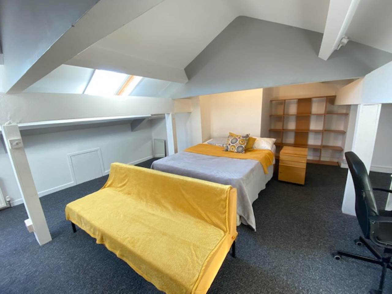 Huge attic bedroom furnished with a king size bed, chest of drawers, wardrobe, sofa, desk and a study chair plus 2 velux windows.