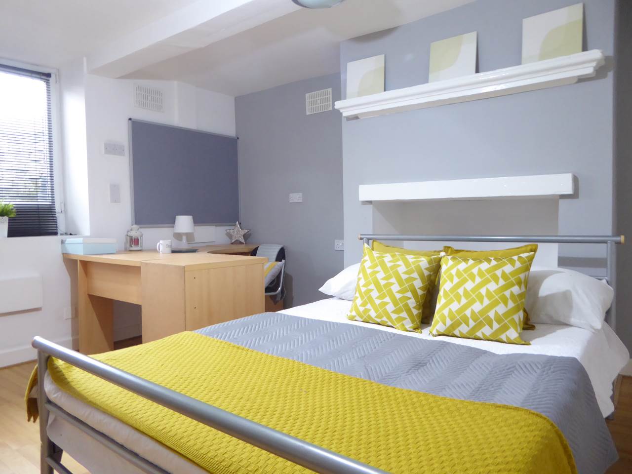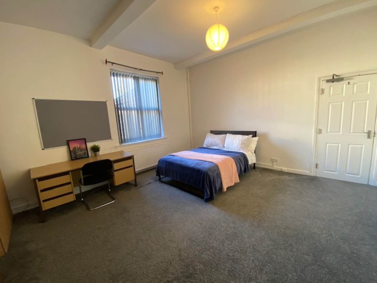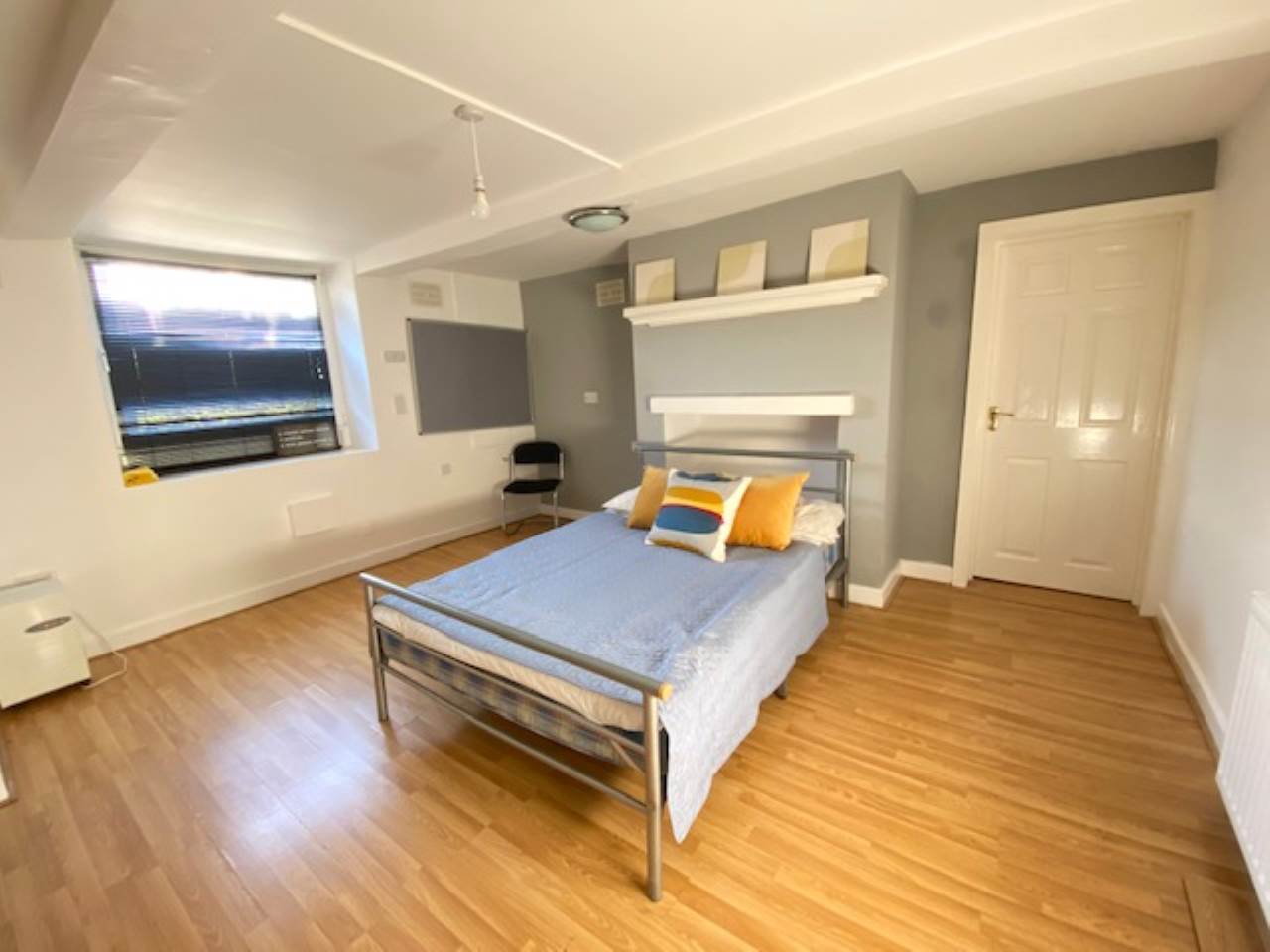 Extra large double bedroom with modern decor and laminated flooring. Furnished with a king size bed, large wardrobe, IKEA shelving unit, large study desk and a study chair, making this a perfect area for studying or relaxing.