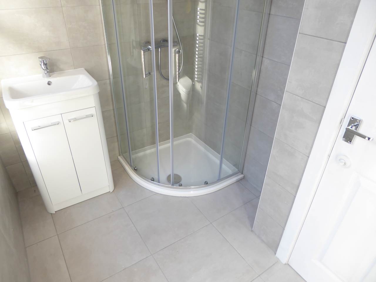 Bathroom includes a shower cubicle with a power shower, wc and wash basin with a vanity unit.