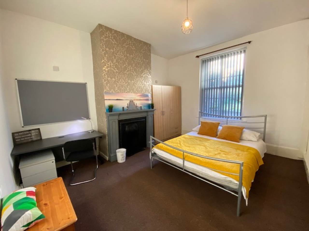 Double bedroom furnished with a double bed, chest of drawers, wardrobe, desk and a study chair.