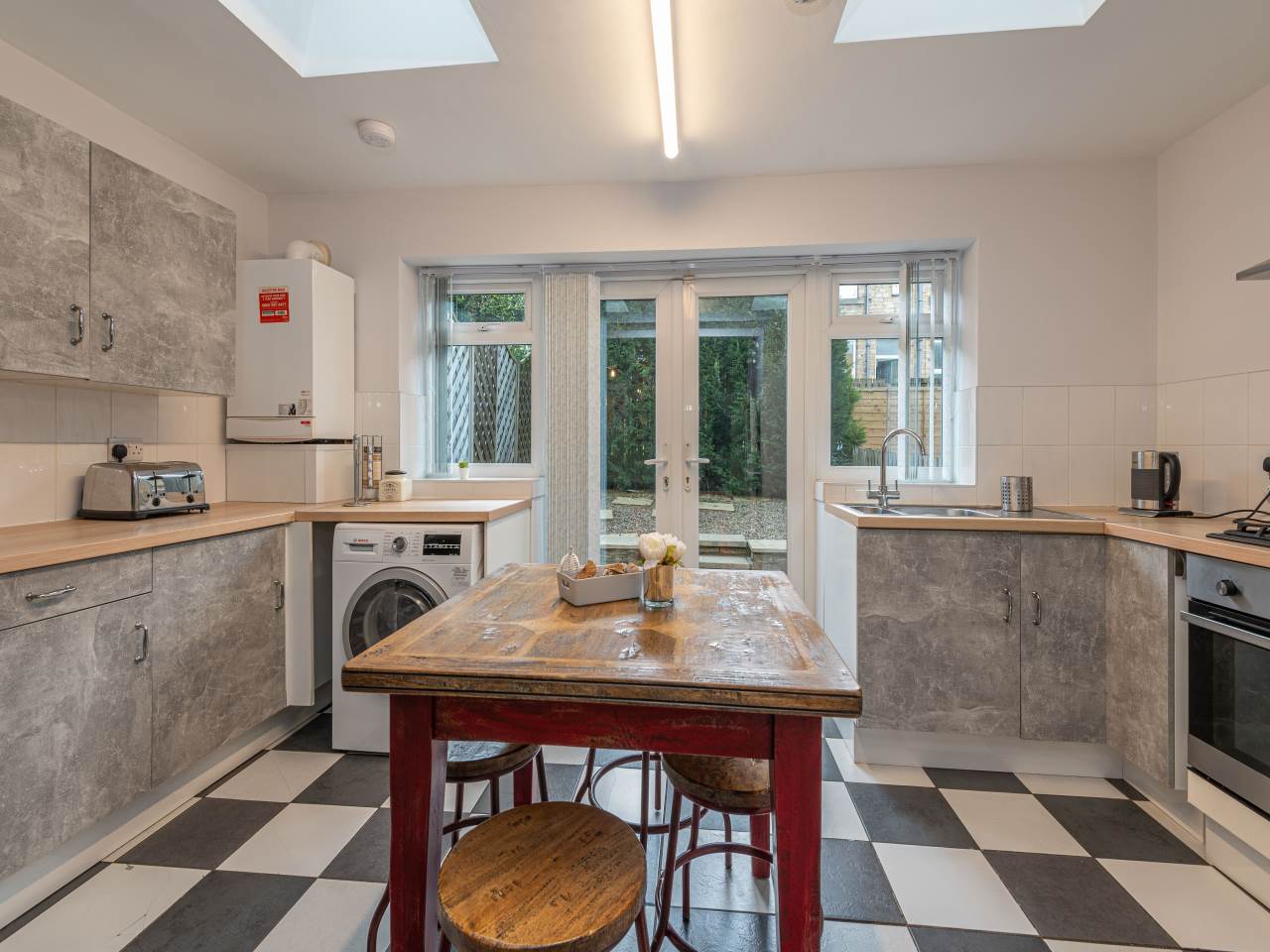 The kitchen is fitted with a large fridge/freezer, washing machine, integrated oven, hob, extractor fan, kettle, microwave and toaster. There is also a square dining table with 4 stools.