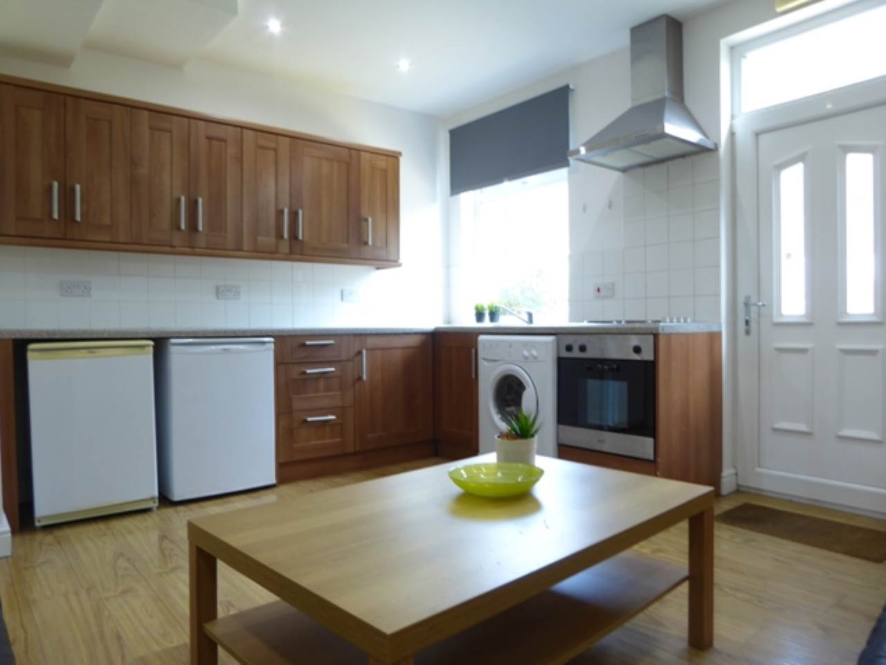 Large open plan Kitchen and Dining Area. The Kitchen includes Kitchen with ample storage, Oven, hob, extractor fan. Laminated Flooring.