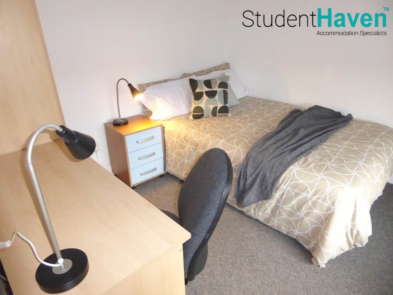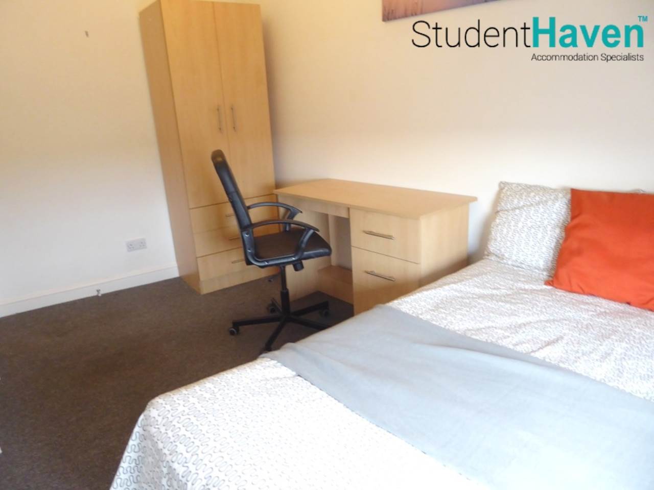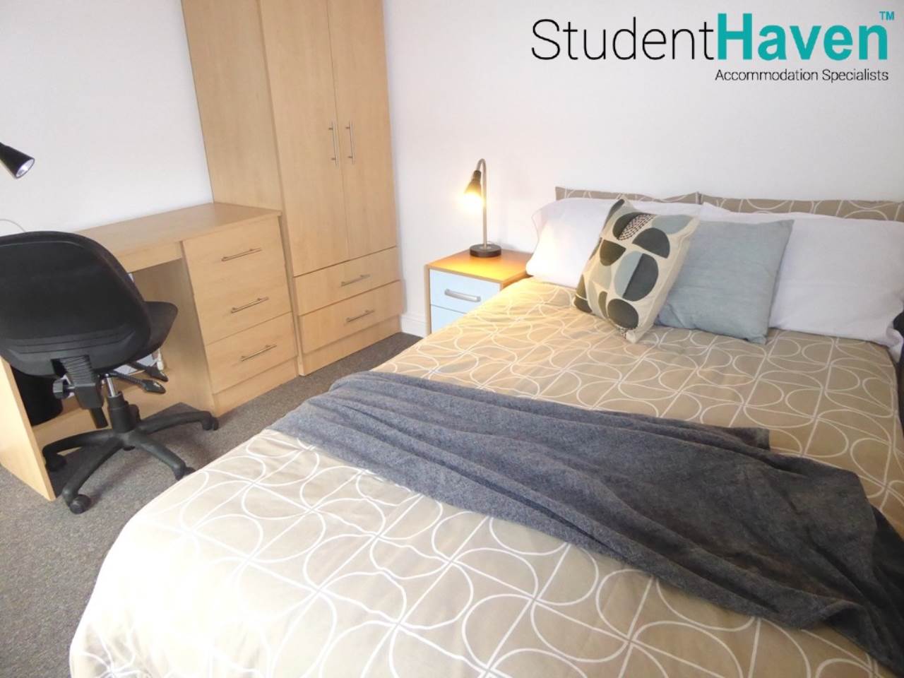 Spacious bedroom furnished with double bed, desk, chair, wardrobe and drawers.