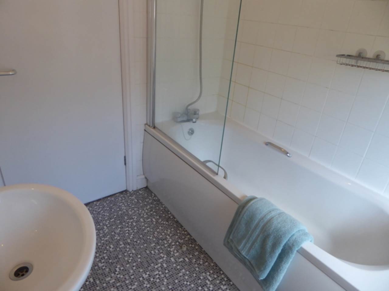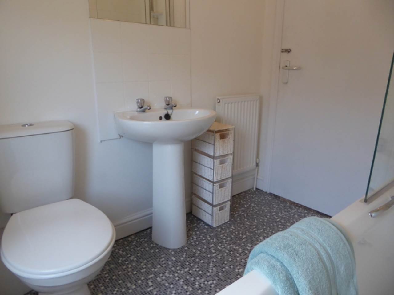 Bathroom comprises of bath, shower, WC, wash basin with mirror above and storage unit.