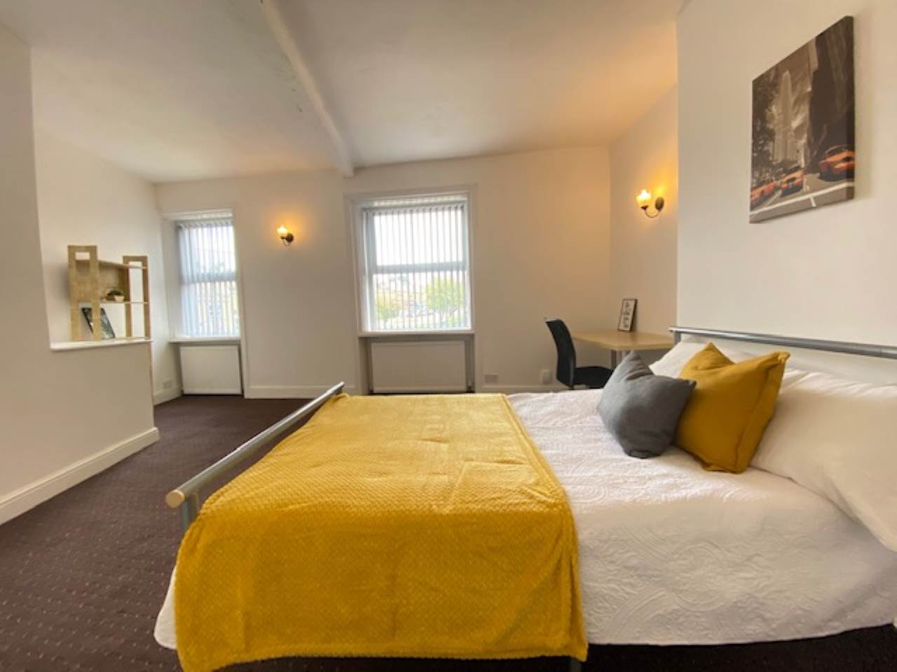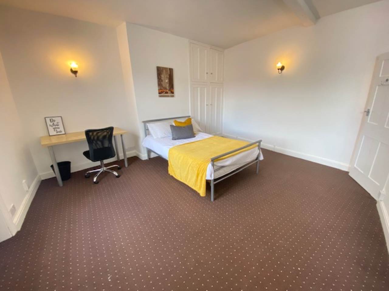 Large double bedroom compromises of a double bed, desk, chair and wardrobe.