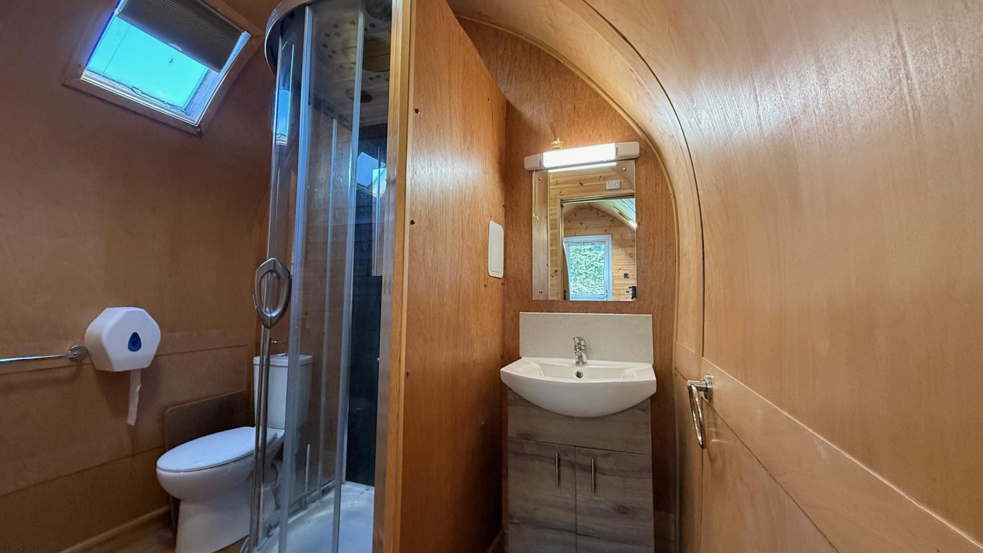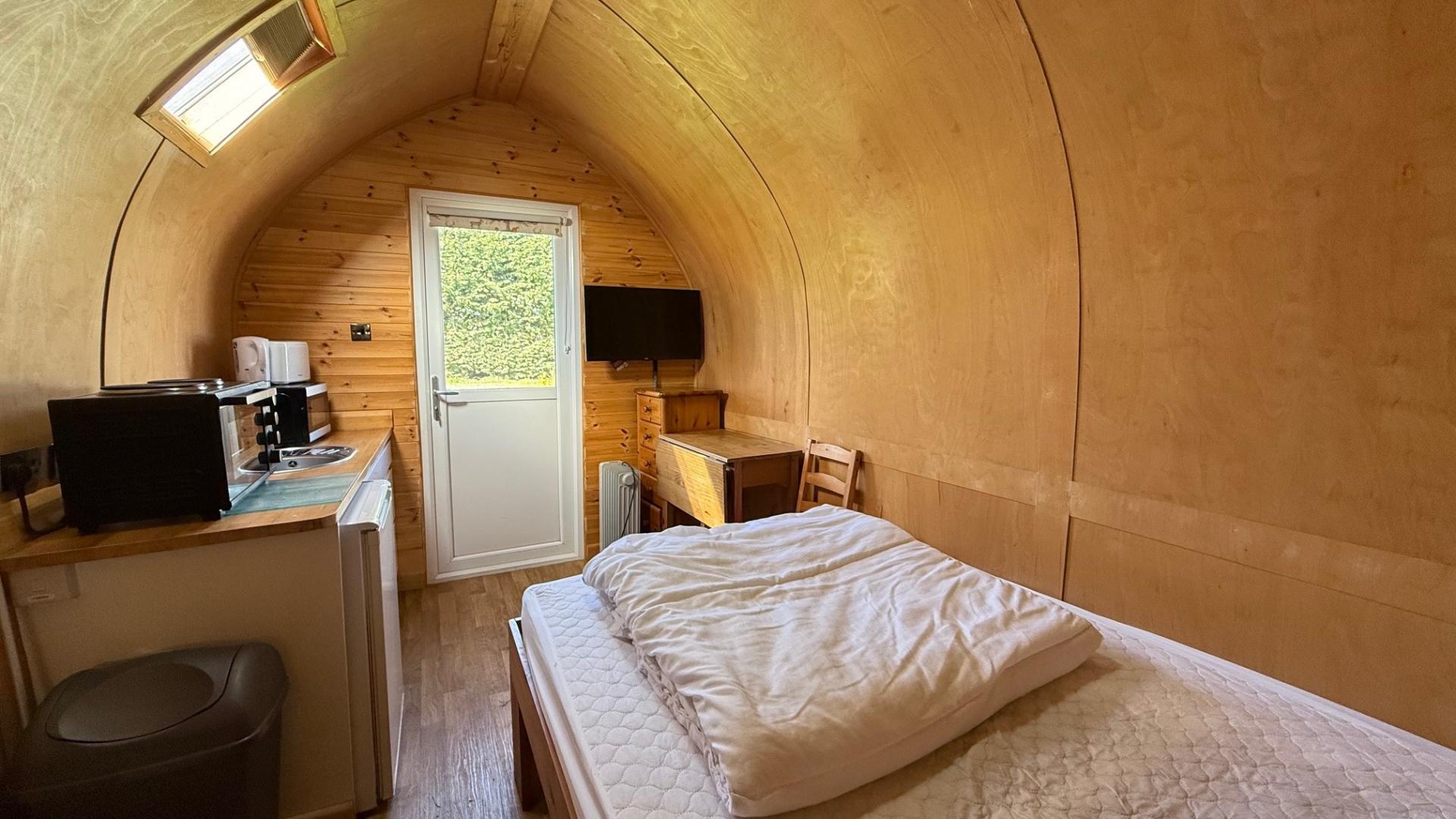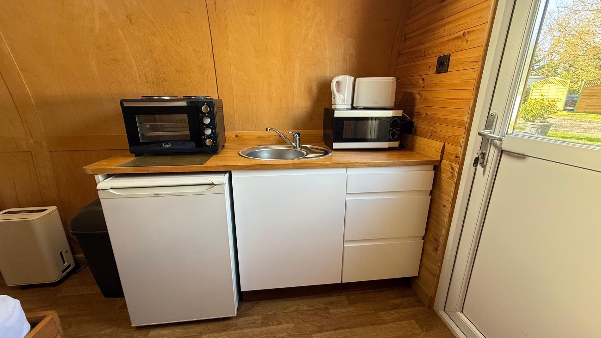 Furnished to include Kitchenette area with stainless steel sink, undercounter fridge, countertop oven with two ring hotplate and microwave. There is a bed with mattress, table and chair. The separate shower room at the rear of the pod includes, a three-piece suite consisting of shower enclosure, WC and wash hand basin.