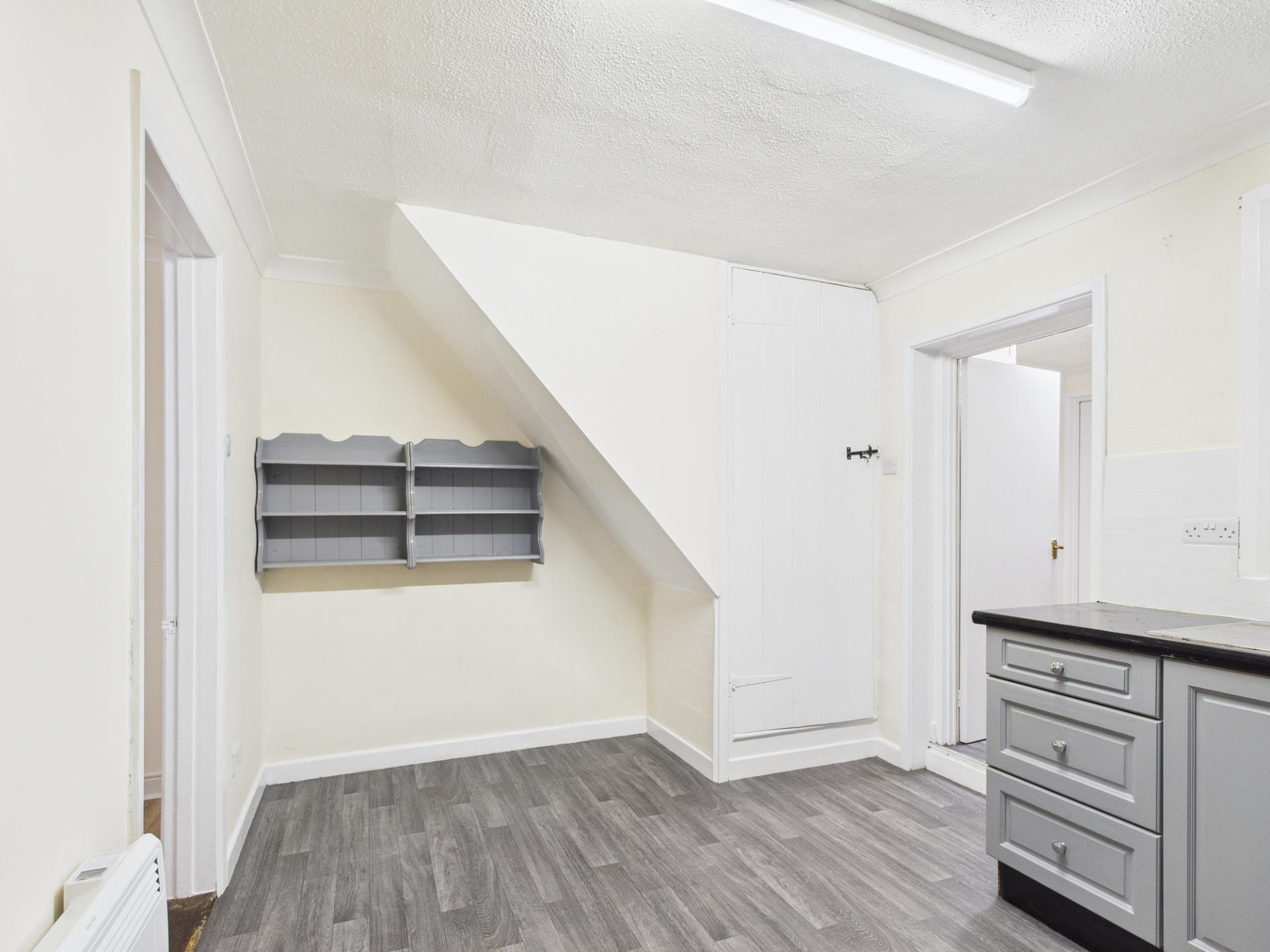 Fitted with a range of wall mounted and base units with worksurface over. Freestanding electric cooker. Stainless steel sink and drainer unit. Space for fridge/freezer. Electric heater. UPVC window to rear elevation. Stairs to first floor.