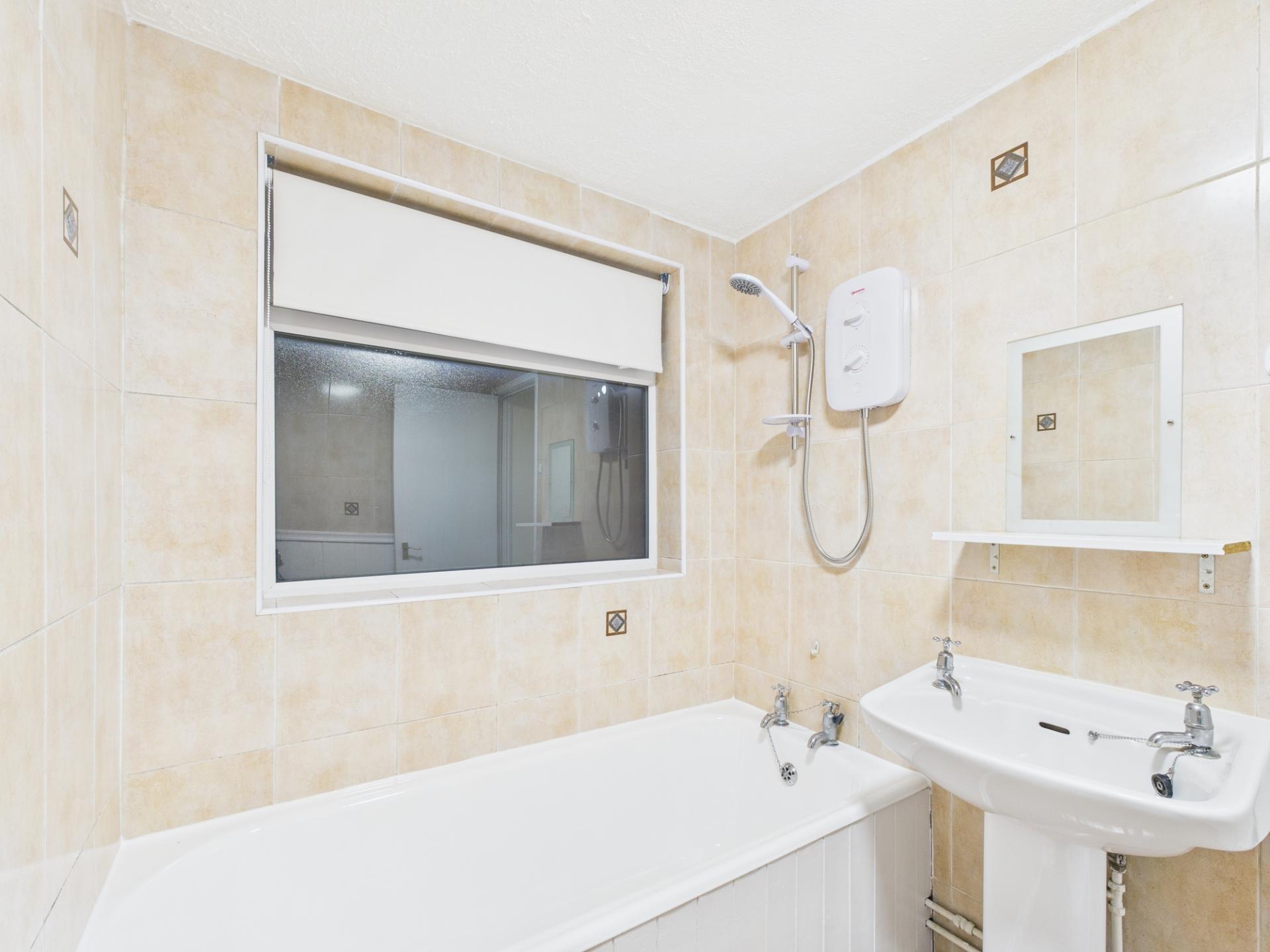 Fitted with a three-piece suite comprising bath with shower over, WC with low level cistern and wash hand basin. Electric heater. Obscure UPVC windows to side and rear elevations.