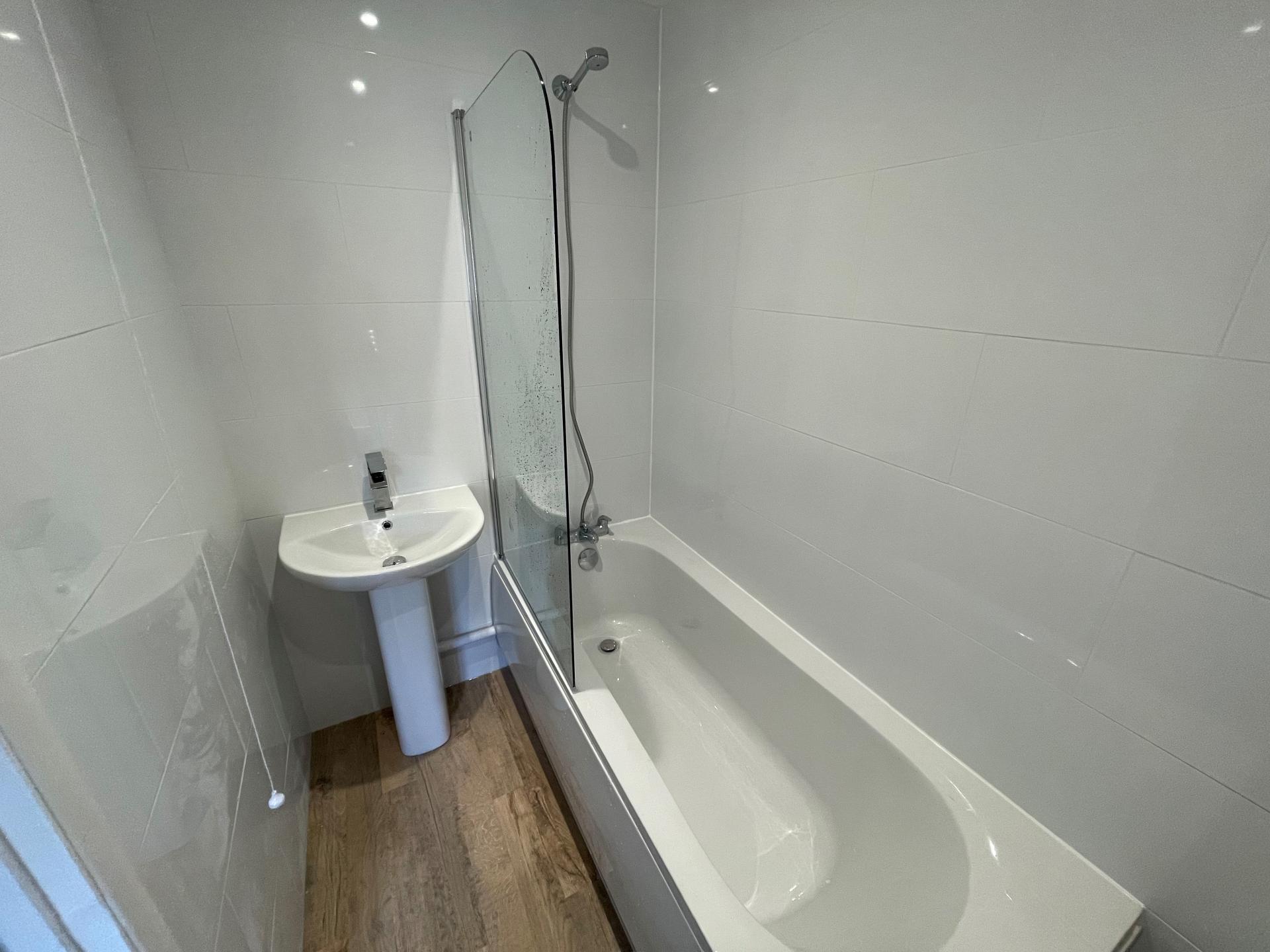 Fitted with a three-piece suite comprising panelled bath with bath/shower mixer tap, WC with low level cistern and wash hand basin. Chrome heated towel rail.