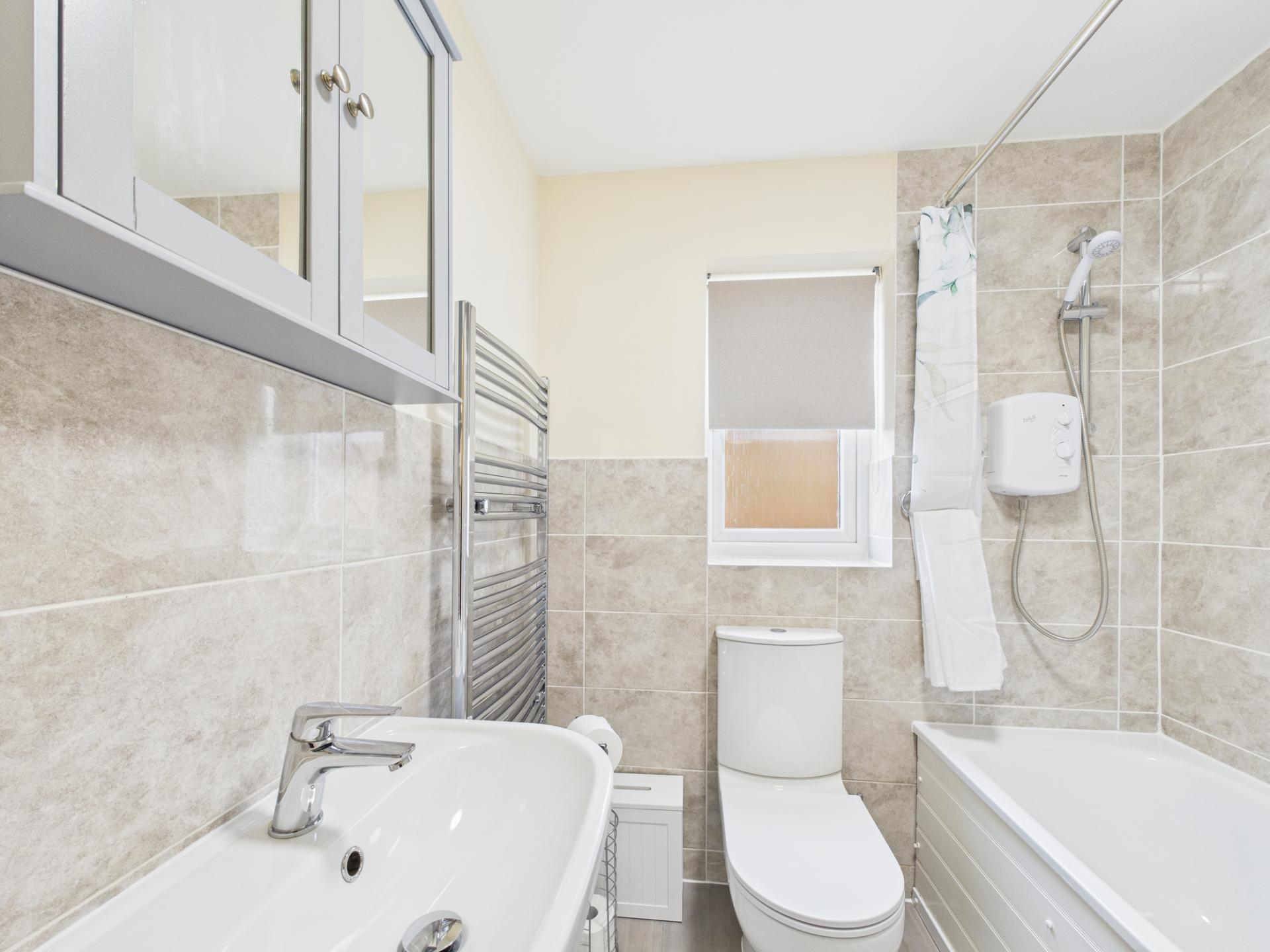 Fitted with a three piece suite comprising panelled bath with independent electric shower over, WC with low level cistern and wash hand basin. Tiled surrounds. Heated towel rail. Obscure UPVC window to side elevation.