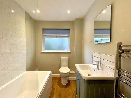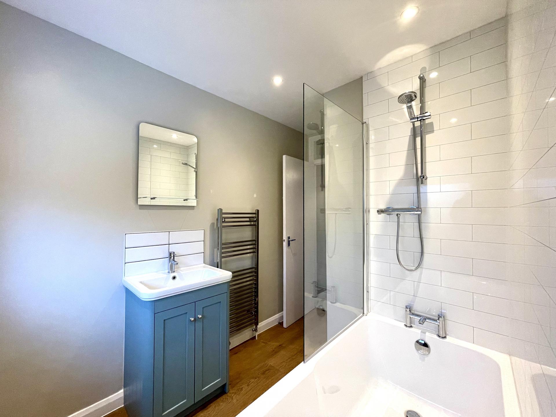 Upstairs, the property offers three bedrooms, including a good-sized principal bedroom and a further double, along with a third bedroom that would also work well as a nursery or study. Each bedroom benefits from built-in wardrobes. These are served by a newly installed family bathroom fitted with a bath and overhead plumbed shower.