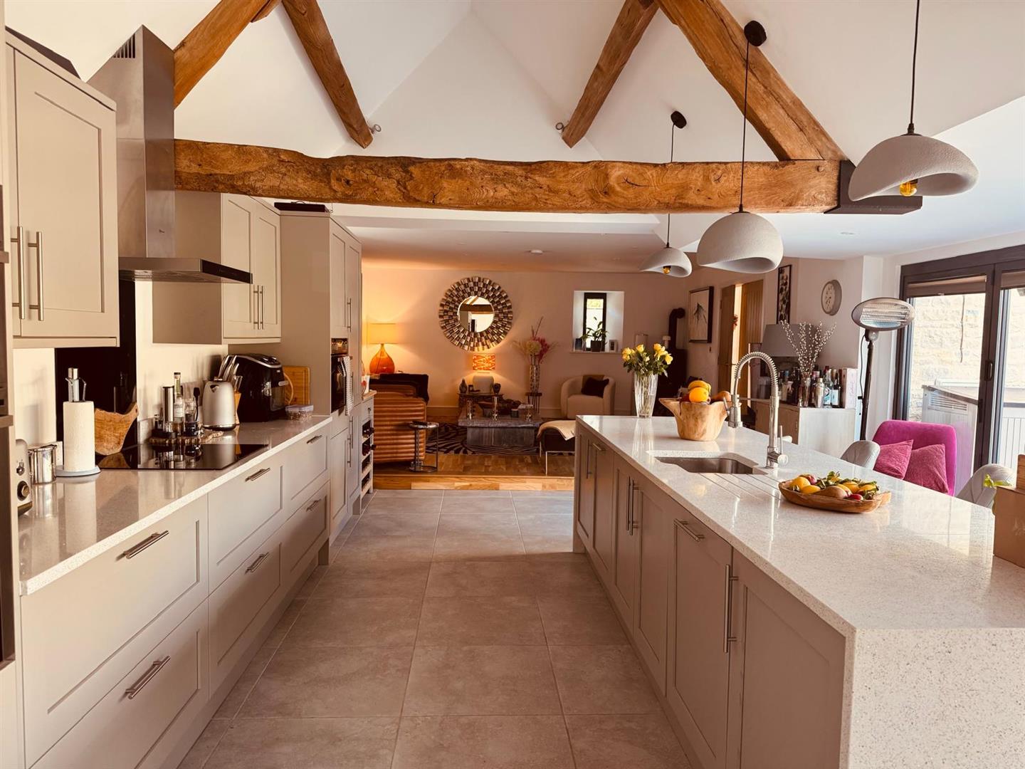 The modern kitchen is both elegant and functional, boasting a large island with breakfast bar, ample storage, stylish cabinetry, and a double fridge. The adjoining dining area features a large dining table and sofa, creating the perfect space for hosting family and friends. A practical 4th bedroom or study is located just off the dining room, and benefits from its own en-suite. Expansive French doors span the front wall of the barn, flooding the room with natural light and opening out to the garden, seamlessly blending indoor and outdoor living.