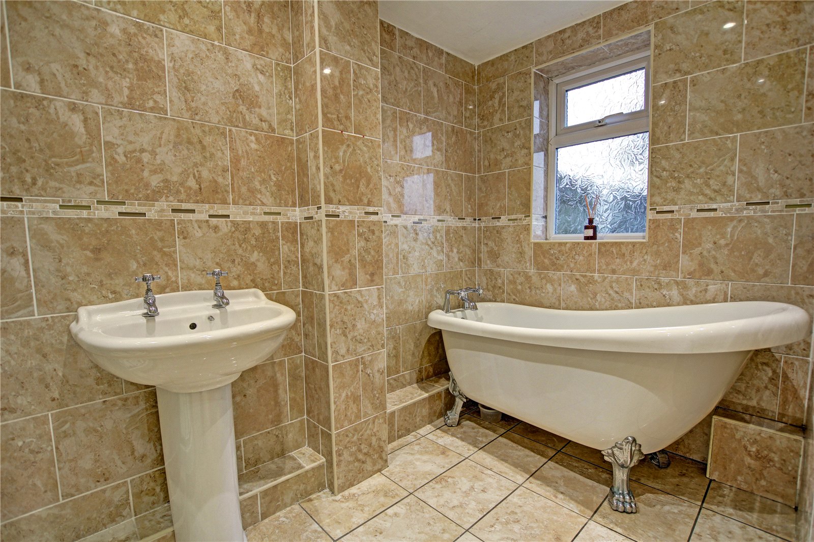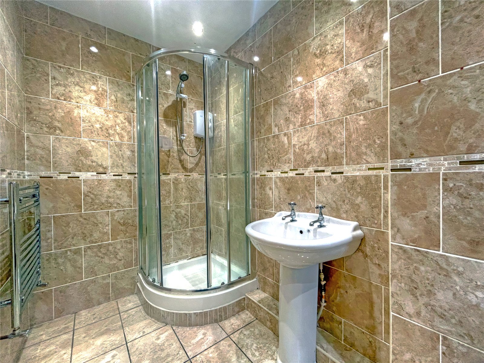 Roll top bathtub, pedestal wash basin, corner shower cubicle with sliding doors, extractor fan, towel wall radiator and ceiling spotlights.