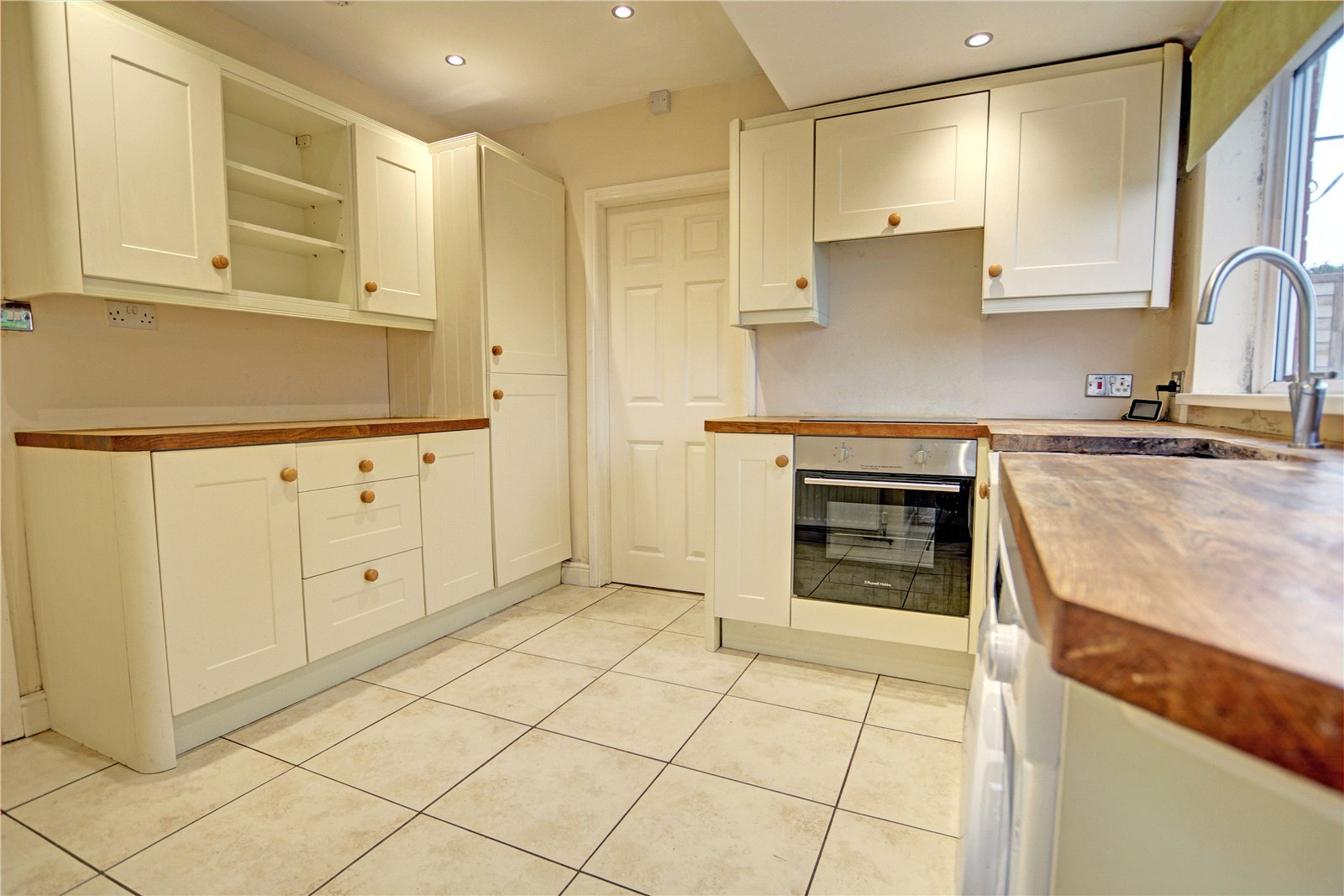 Range of wall and base units with wooden countertops incorporating farmhouse sink and stainless steel mixer tap, intergrated fridge/freezer, electric cooker, induction hob, ceiling spotlights, double glazed window, ceiling spotlights and PVC door leading to rear garden.