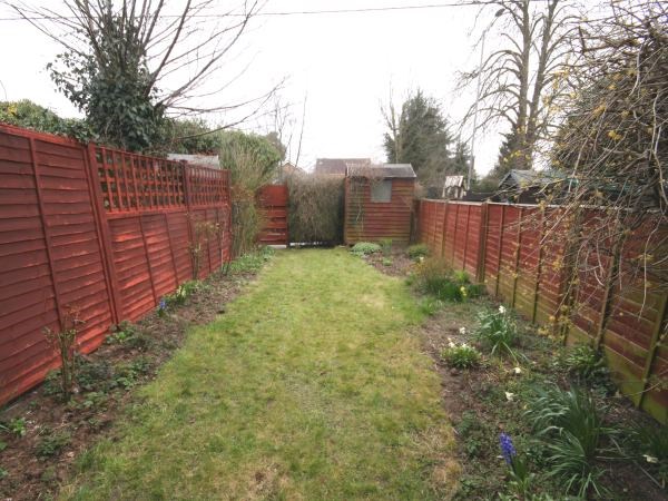 Extending to 25' (7.62m), mainly laid to lawn with patio area, timber shed, enclosed by fencing.