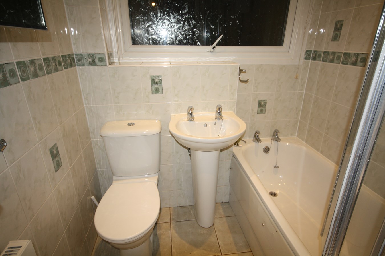 Suite comprising panel enclosed bath with shower attachment and screen, low level wc, pedestal wash hand basin, spotlights, tiled floor and walls, heated towel rail, double glazed frosted window to rear aspect.