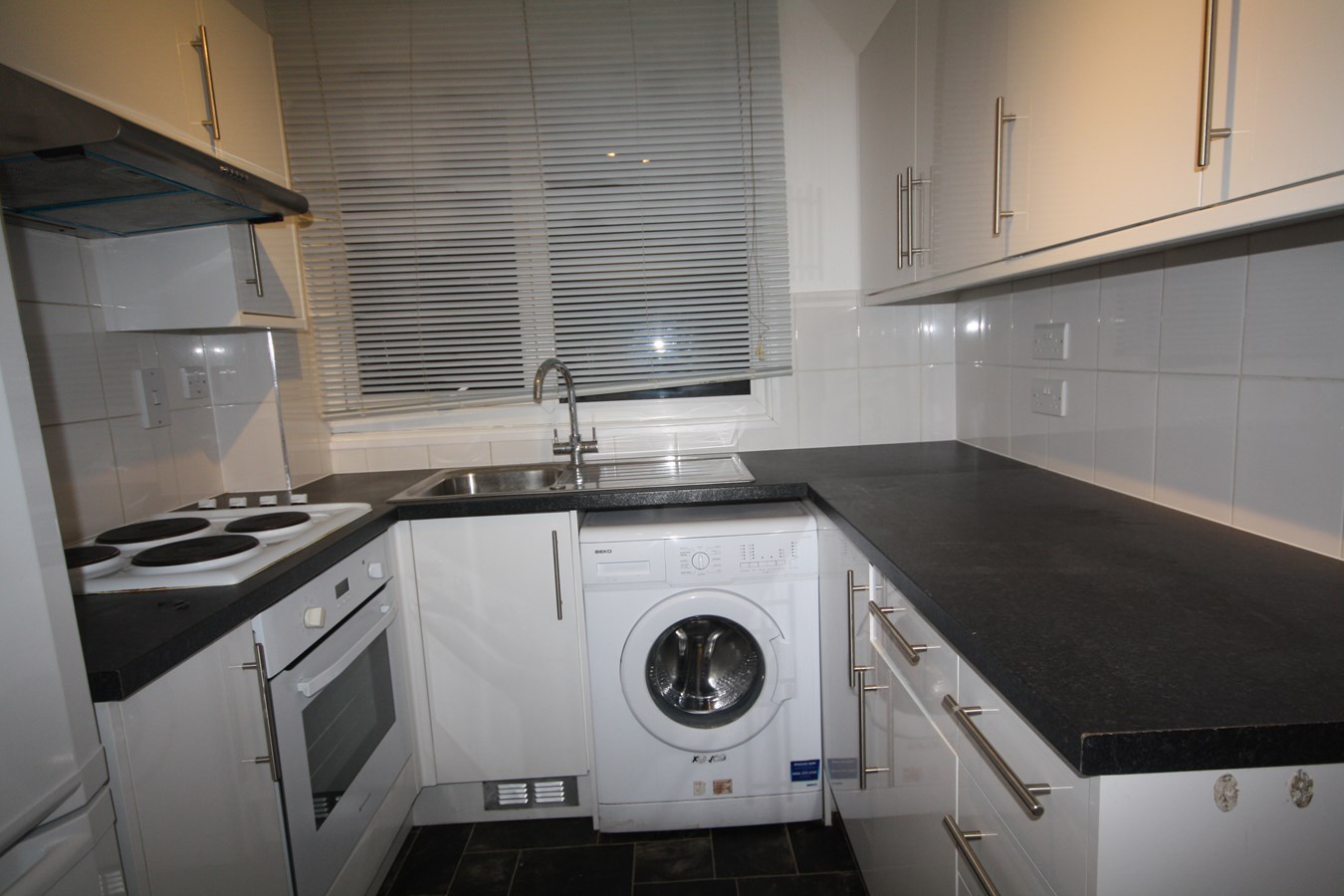 Range of units at base and eye level with worktops over, stainless steel single drainer sink unit, electric hob and oven, cupboard housing boiler, double glazed window to rear aspect.
